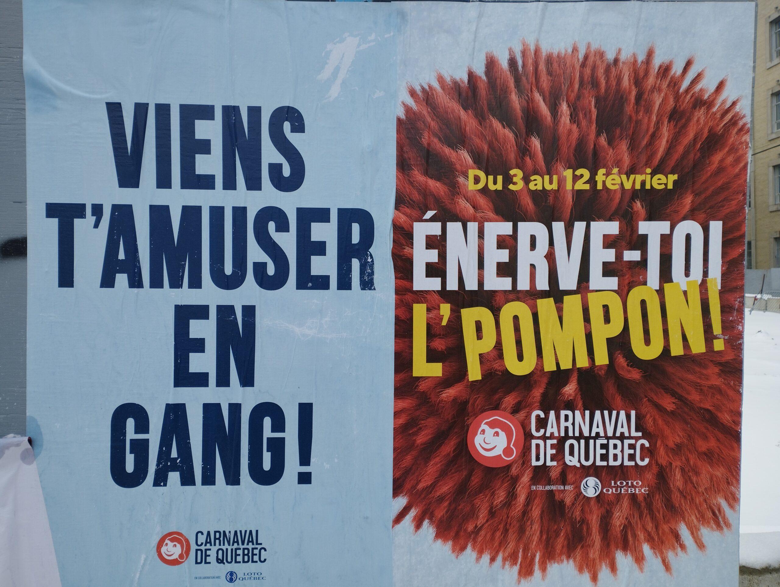 Le thème-slogan de cette année : Énerve-toi l’Pompon ! (Point vocabulaire : l’expression inverse on se calme le pompon existe elle bel et bien en québécois, et signifie plus ou moins « on garde son sang-froid »).