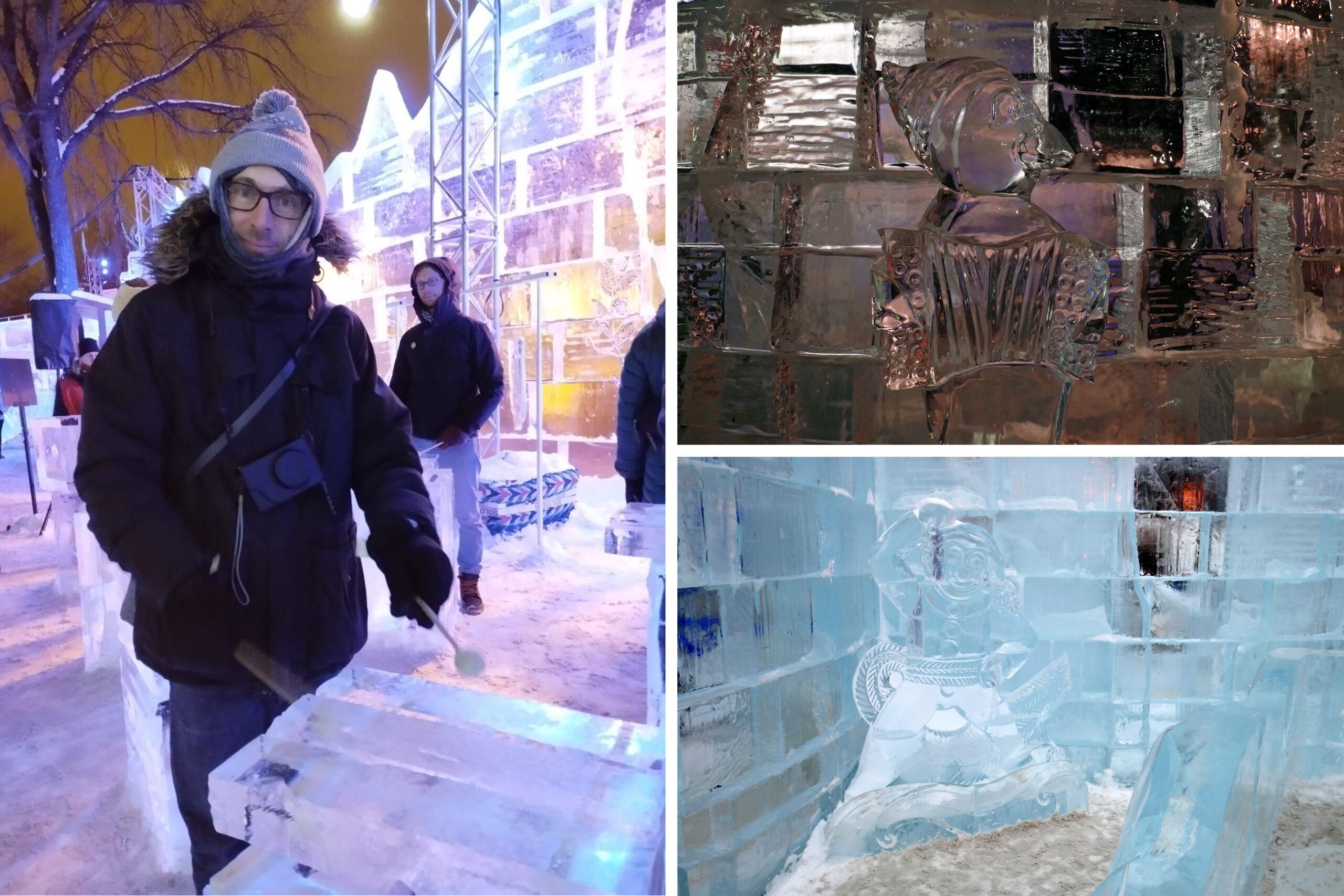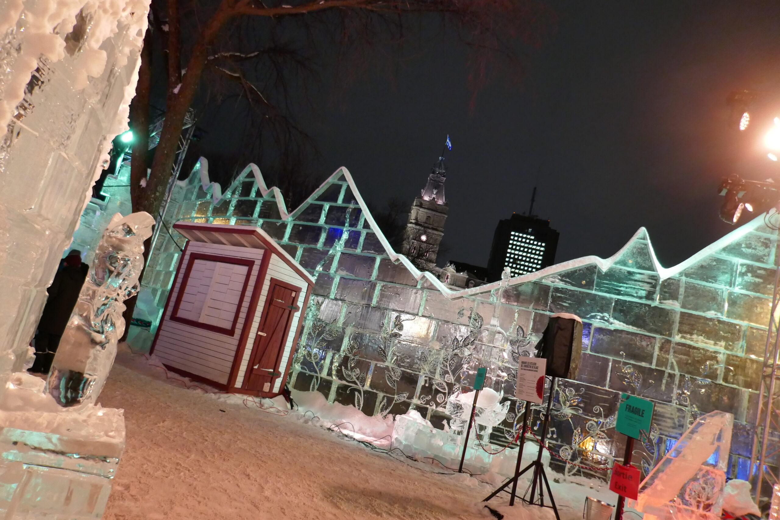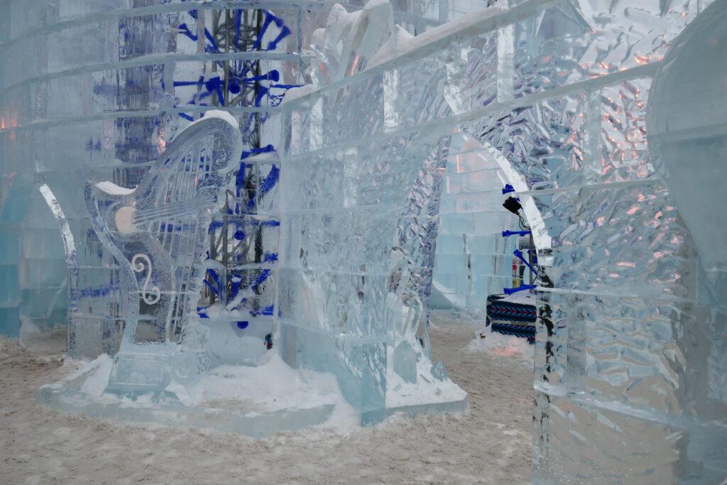 Située face à l’Assemblée Nationale, la Zone Loto-Québec est celle qui accueille le Palais de Bonhomme. Il s’agit ni plus ni moins que d’un palais entièrement érigé en murs de glace. On a bien vu les travaux depuis plus de 2 semaines : il s’agit quand même de hisser 2800 blocs de glace de 200 livres (90kg) chacun, avec une tour culminant à 45 pieds de haut (13,7 m -hauteur considérée comme un maximum pour travailler sans grue).