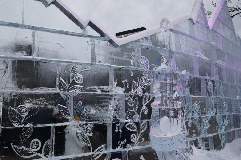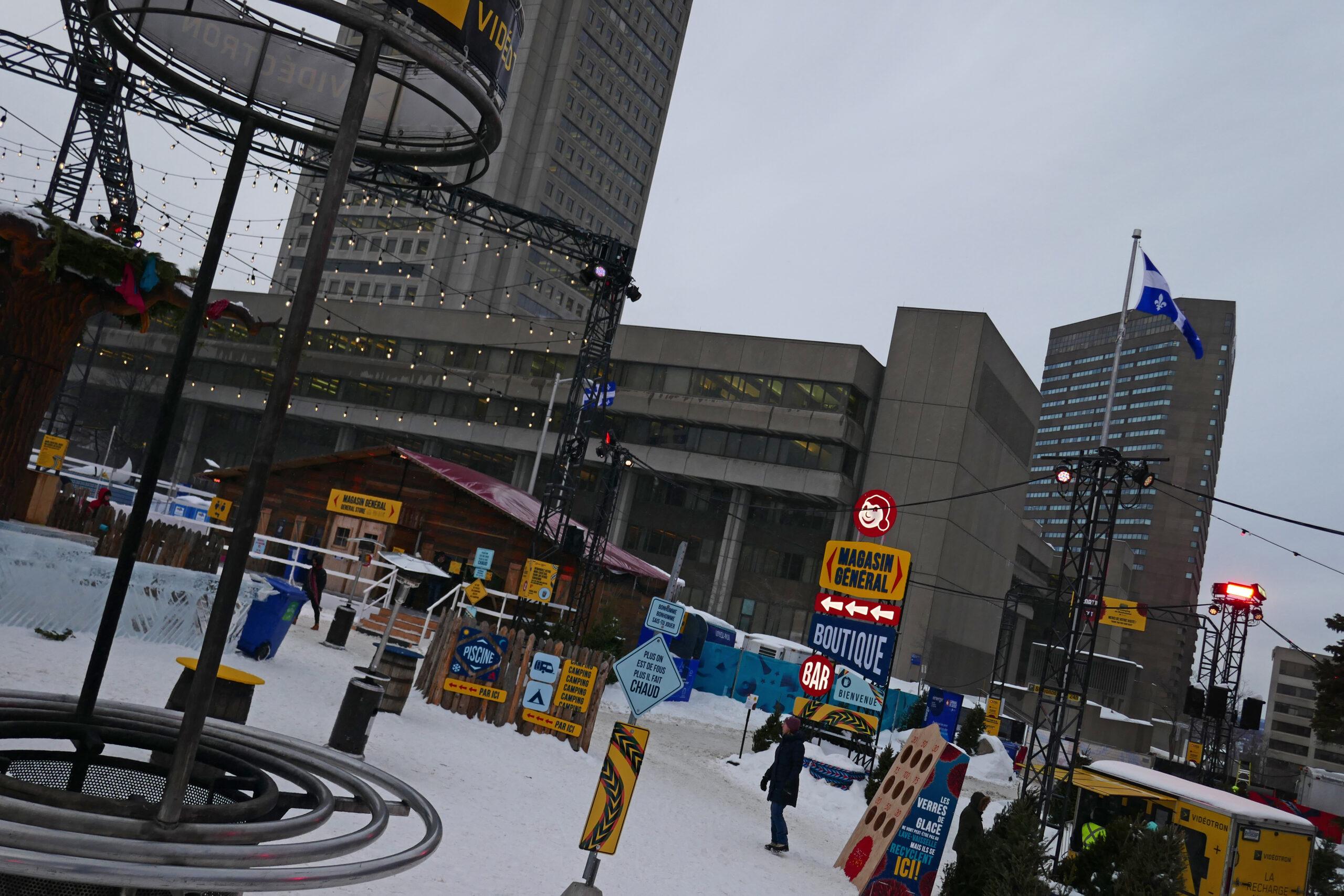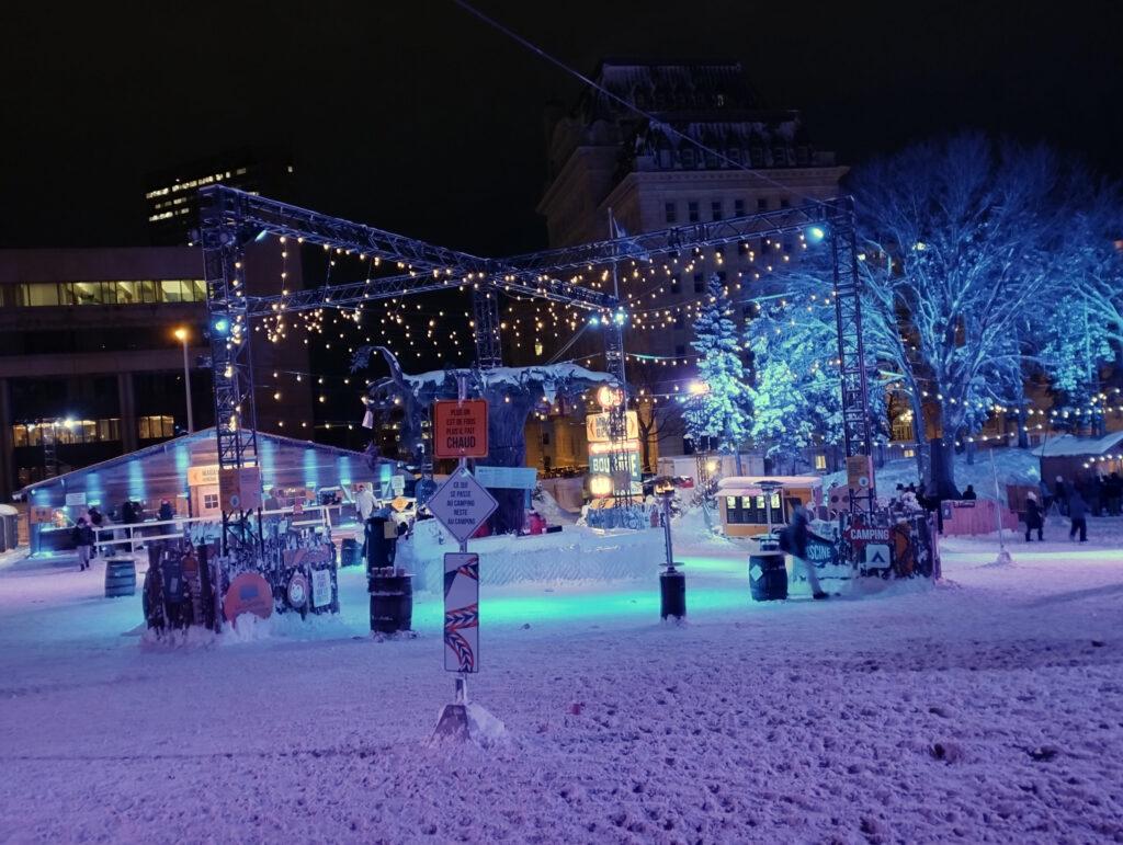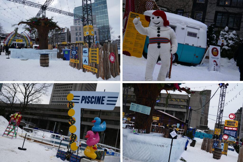 Située face à l’Assemblée Nationale, la Zone Loto-Québec est celle qui accueille le Palais de Bonhomme. Il s’agit ni plus ni moins que d’un palais entièrement érigé en murs de glace. On a bien vu les travaux depuis plus de 2 semaines : il s’agit quand même de hisser 2800 blocs de glace de 200 livres (90kg) chacun, avec une tour culminant à 45 pieds de haut (13,7 m -hauteur considérée comme un maximum pour travailler sans grue).