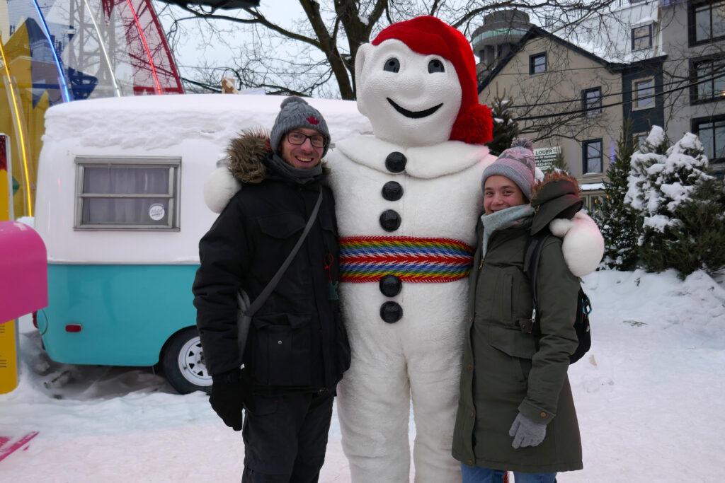 Nous avons ensuite droit à la visite de Bonhomme Carnaval en personne ! Après son entrée dansante sur la chanson Salut Bonhomme, nous allons faire notre photo. « Bienvenue chez vous » qu’il nous dit lorsqu’on avoue être français installés à Québec.