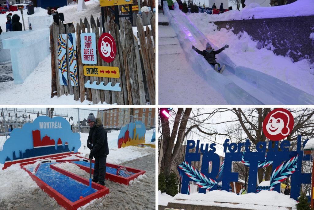 Amandine ne peut ensuite pas résister à une descente en glissade de glace (= toboggan). Juste en face, un jeu de mini-hockey (c’est comme le mini-golf, mais avec une crosse de hockey) nous vaudra une bonne séance d’auto-dérision.