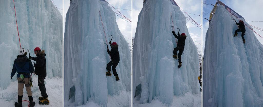 Olivier voulait absolument tenter l’Escalade du Mont de Glace de 30 pieds de haut (le système métrique n’ayant été adopté que dans les années 1970 au Canada, la transition suit toujours son cours -ou pas). Passage du baudrier, des chaussures à crampon et remise d’un casque, puis quelques consignes : c’est parti pour la montée. Le choix entre le coté facile (légèrement incliné) et le coté difficile (abrupte) est complexe, mais ce sera le difficile ! Rapidement, ça sollicite beaucoup (mais alors beaucoup!) les bras. Un piolet après l’autre, il faut trouver (ou creuser) un point d’accroche, puis faire de même avec les pieds, tout en conservant un certain écartement des jambes. Un peu plus de 9 mètres plus haut (on fait la conversion pour vous), c’est la victoire ! La descente sera plus aisée puisqu’on se laisse descendre avec la corde en s’appuyant simplement sur les pieds.