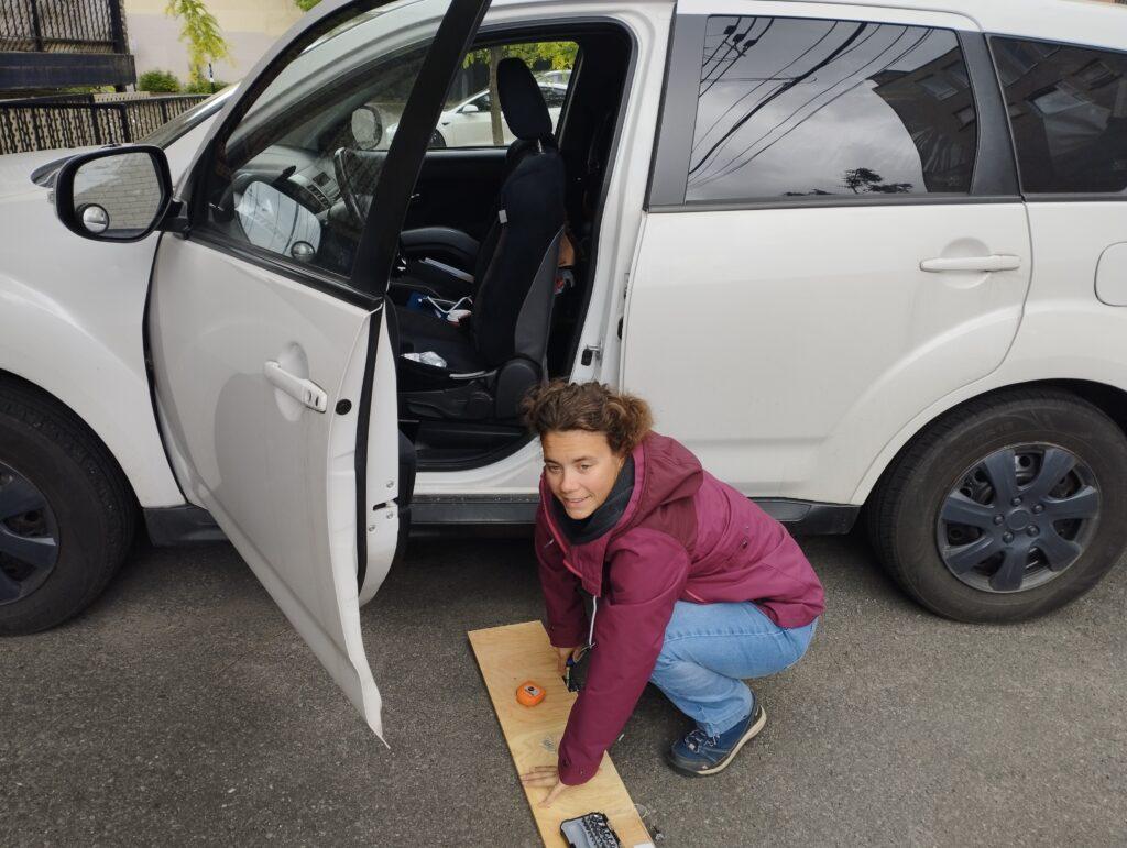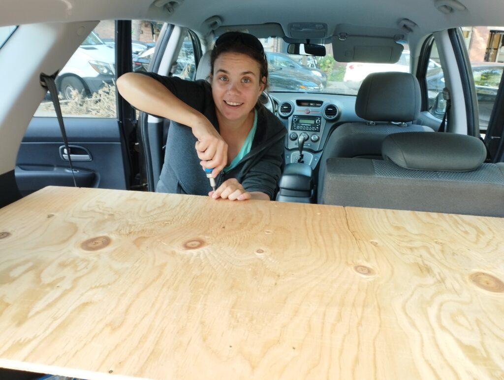 L’hiver est passé sans qu’on n’avance dans l’aménagement intérieur de l’auto. Avril, le road-trip commence : on est motivés, et malgré le froid et la neige on décide de se relancer dans la fabrication d’un lit ! Une catastrophe et un désespoir : rien ne tiens avec les vis ! Il nous faut tout reprendre à la colle… sauf que la colle ne prend pas à -1°C… Bon, échec total, à un détail prêt : on sait qu’il nous faut impérativement acheter des vis plus longues, avec une tête correcte, et qui pénètre correctement le bois.