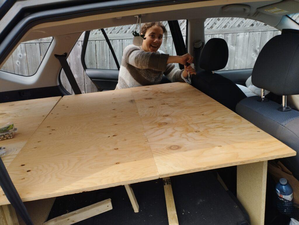 Alors qu’une journée en road-trip, nous avions un peu de temps… Tout de suite, avec des vis correctes, ça va mieux ! La partie arrière est refixée correctement et ne tombe plus quand on plie les sièges, les découpes des tasseaux pour les pieds sont faites avec les nouvelles mesures. Pour la première fois, on a avancé.