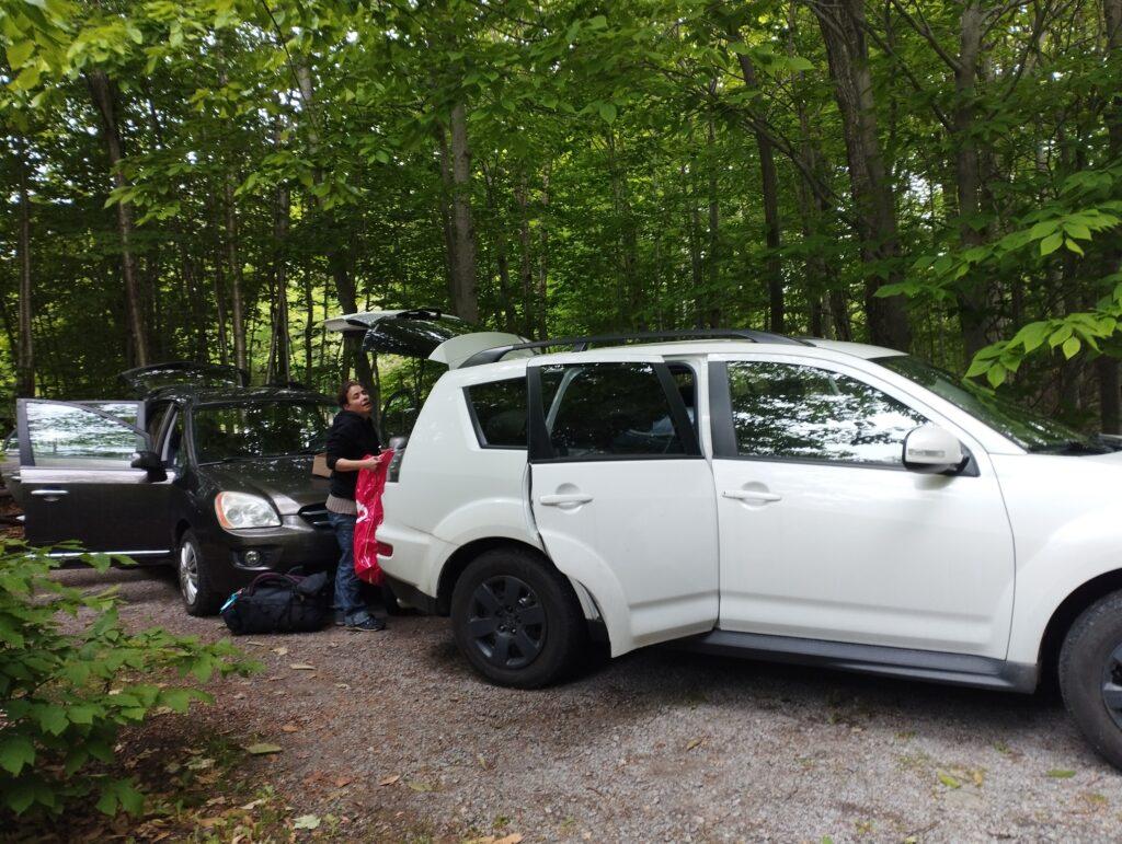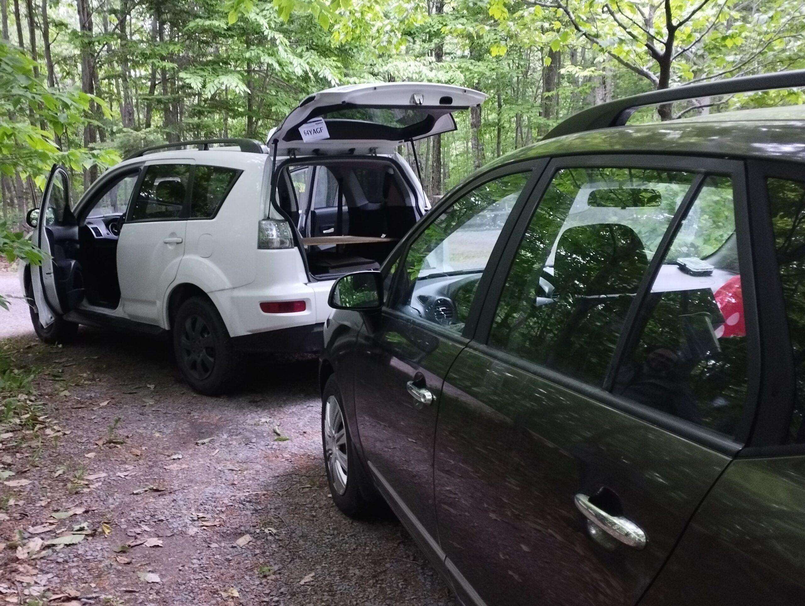 Le 6 juin, on dit bienvenue à notre « nouvelle » 2010 Mitsubishi Outlander. On respire : plus de grincements louches dans les virages, plus de bruit strident à chaque coup de frein ! Certes délestés de toutes nos économies de l’hiver, nous allons néanmoins pouvoir repartir sur une base saine, direction : le grand ouest canadien ! En attendant, c’est au camping qu’il nous faut démonter et remonter notre lit… Les tailles des planches ne correspondent plus au découpage de la nouvelle voiture, mais qu’importe, ça fera bien l’affaire 😀 (Pour la hauteur des tasseaux par contre, il faut évidemment repasser à l’étape « scie » …)