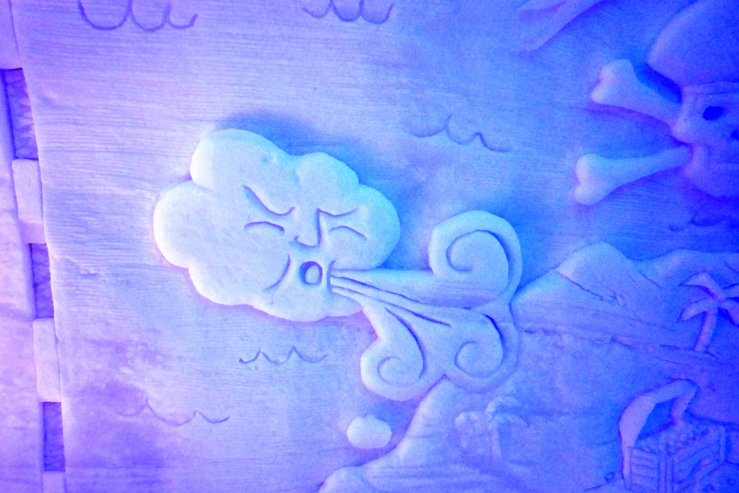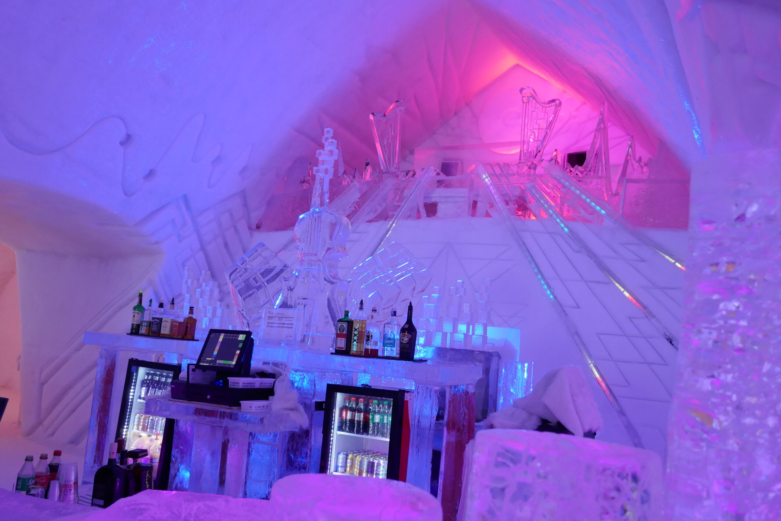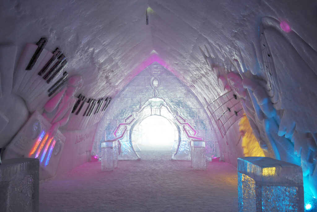 Avec les températures positives en-dehors, les zones tampons intérieur-extérieur en prennent un sacré coup ! Mais à l’intérieur, les -5°C permettent aux sculptures de glace et de neige de tenir le choc.