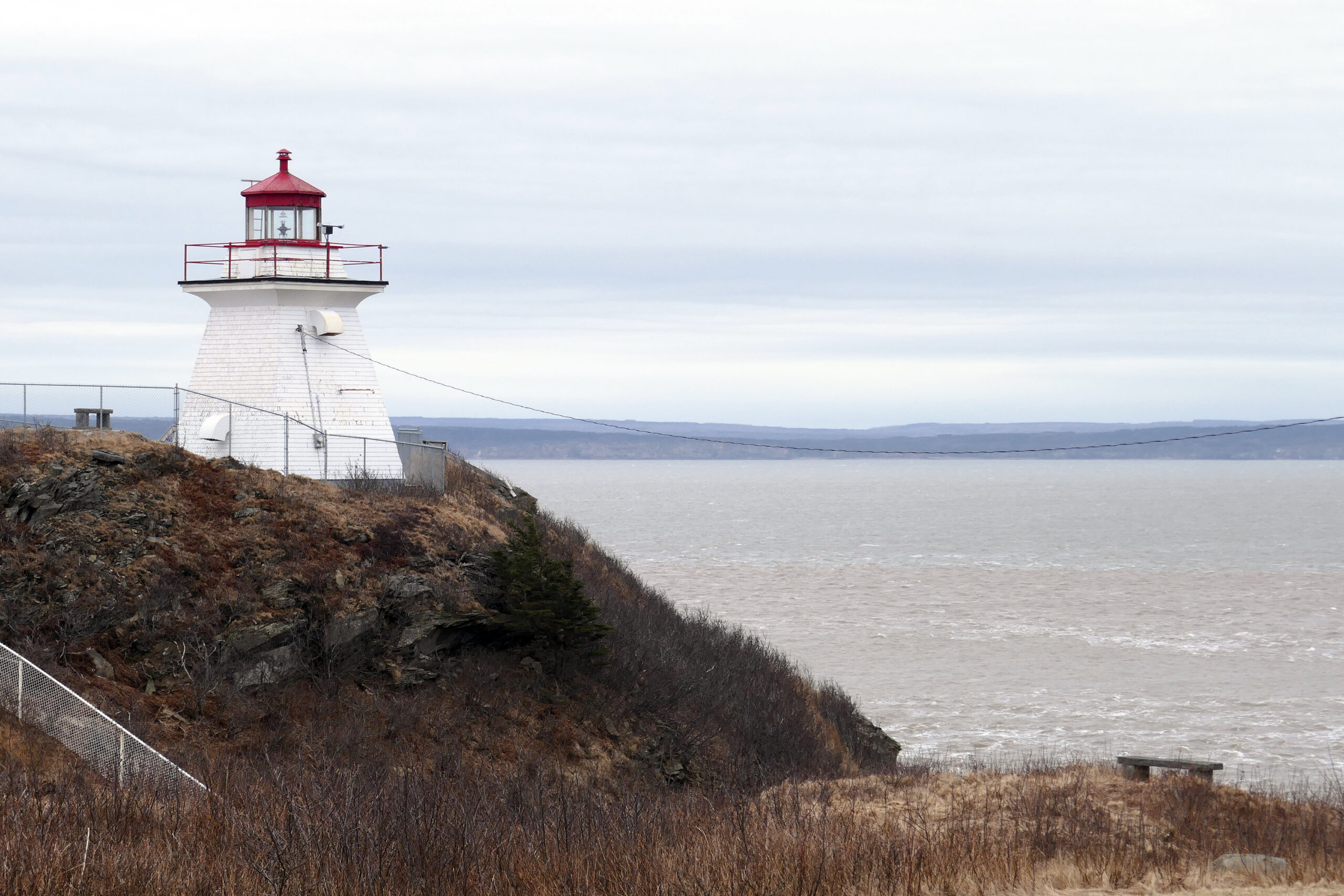 Longeant la côte sud du Nouveau-Brunswick et la Baie de Fundy par la route 915, nous traversons plusieurs hameaux agricoles. Nous voulions faire un détour par le phare de Cap Enragé. Si les activités du site ne sont pas visitables en hors saison, on peut bien voir le phare et la falaise.