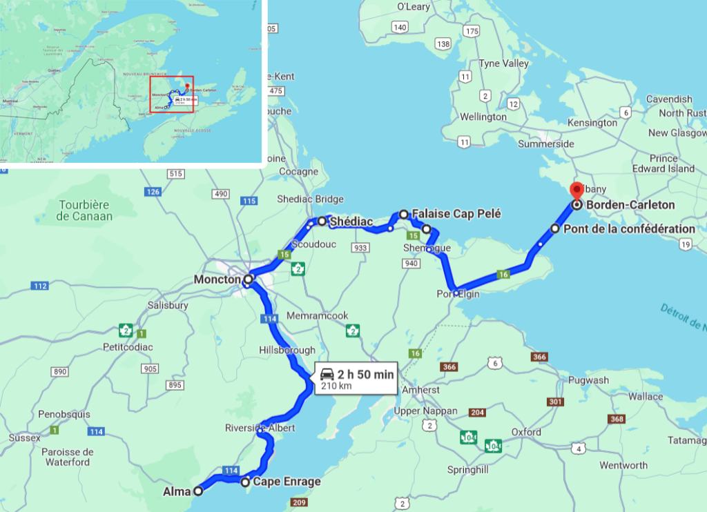 Quittant Alma et le Parc national Fundy au Nouveau-Brunswick, nous nous dirigeons vers le pont reliant le continent à la 7ème Province du Canada en passant par Moncton -la plus grande ville de la Province du Nouveau-Brunswick- ainsi que Shédiac. Quoi de mieux que de longer la côte ?
