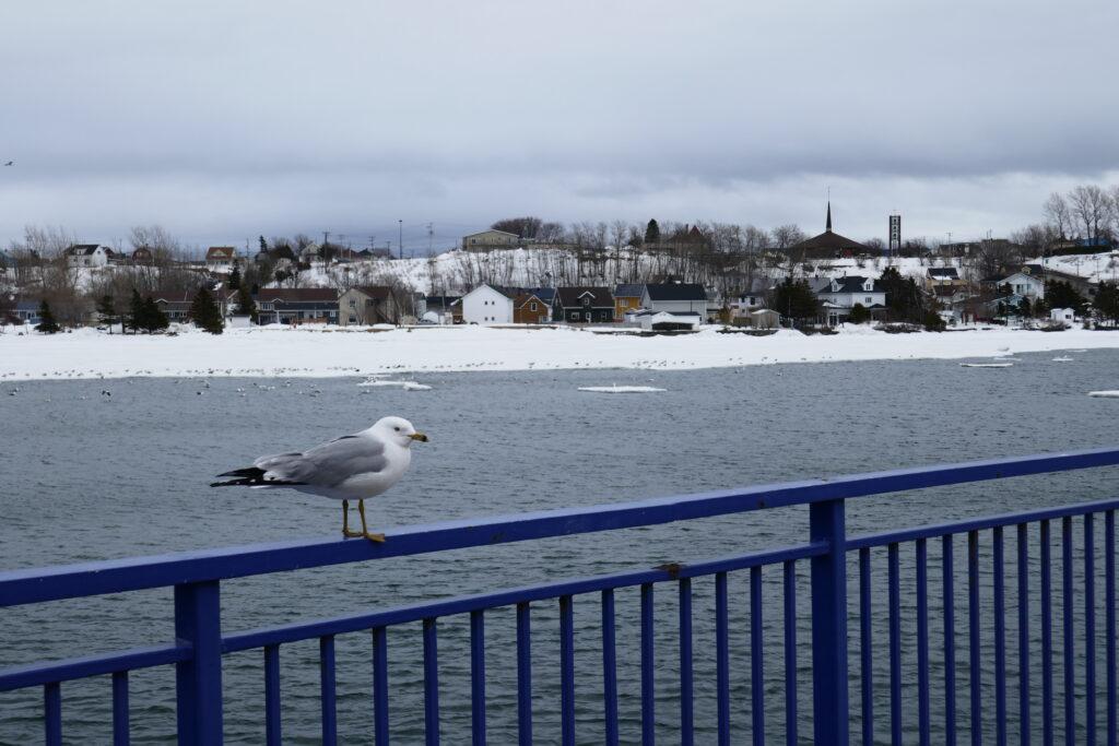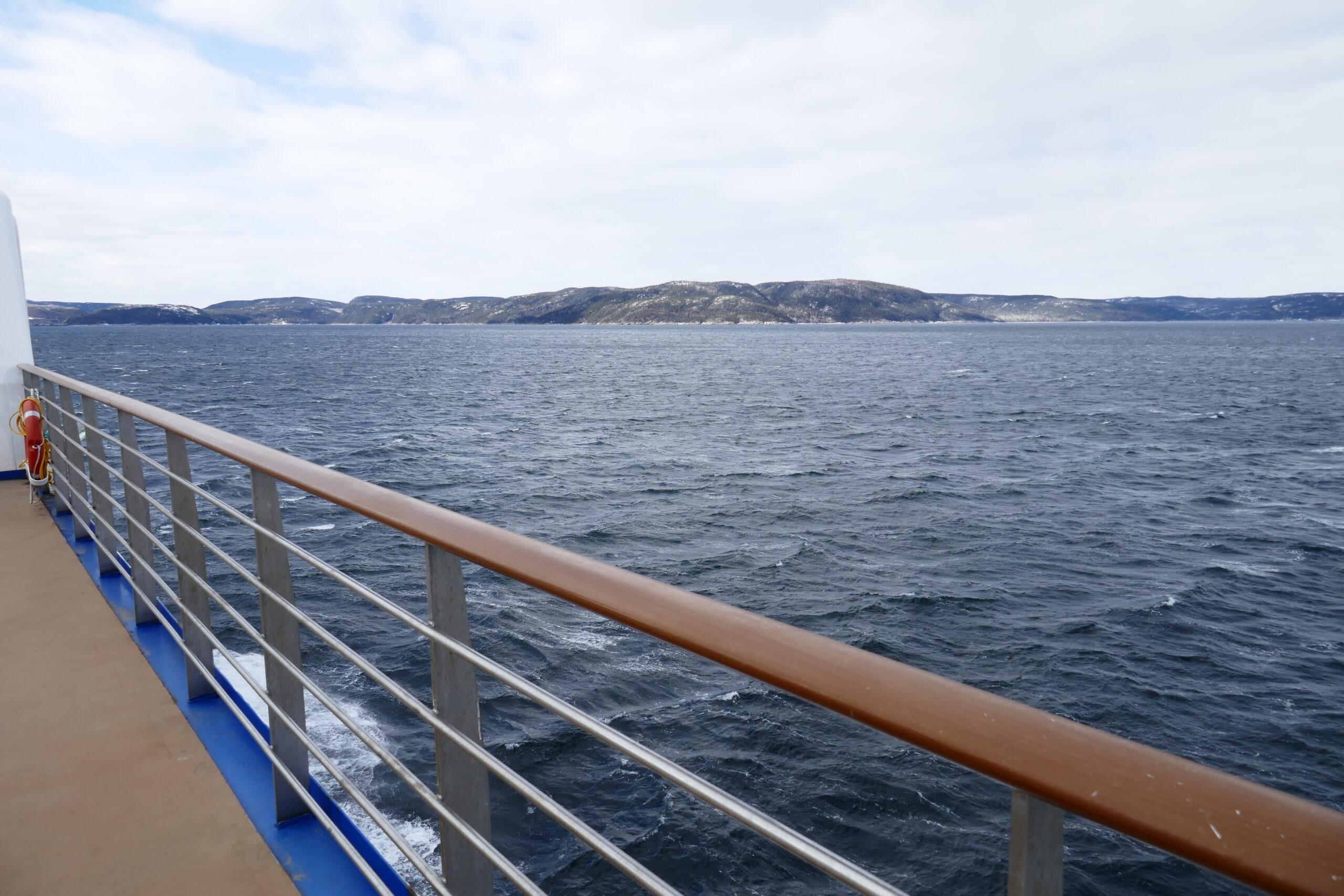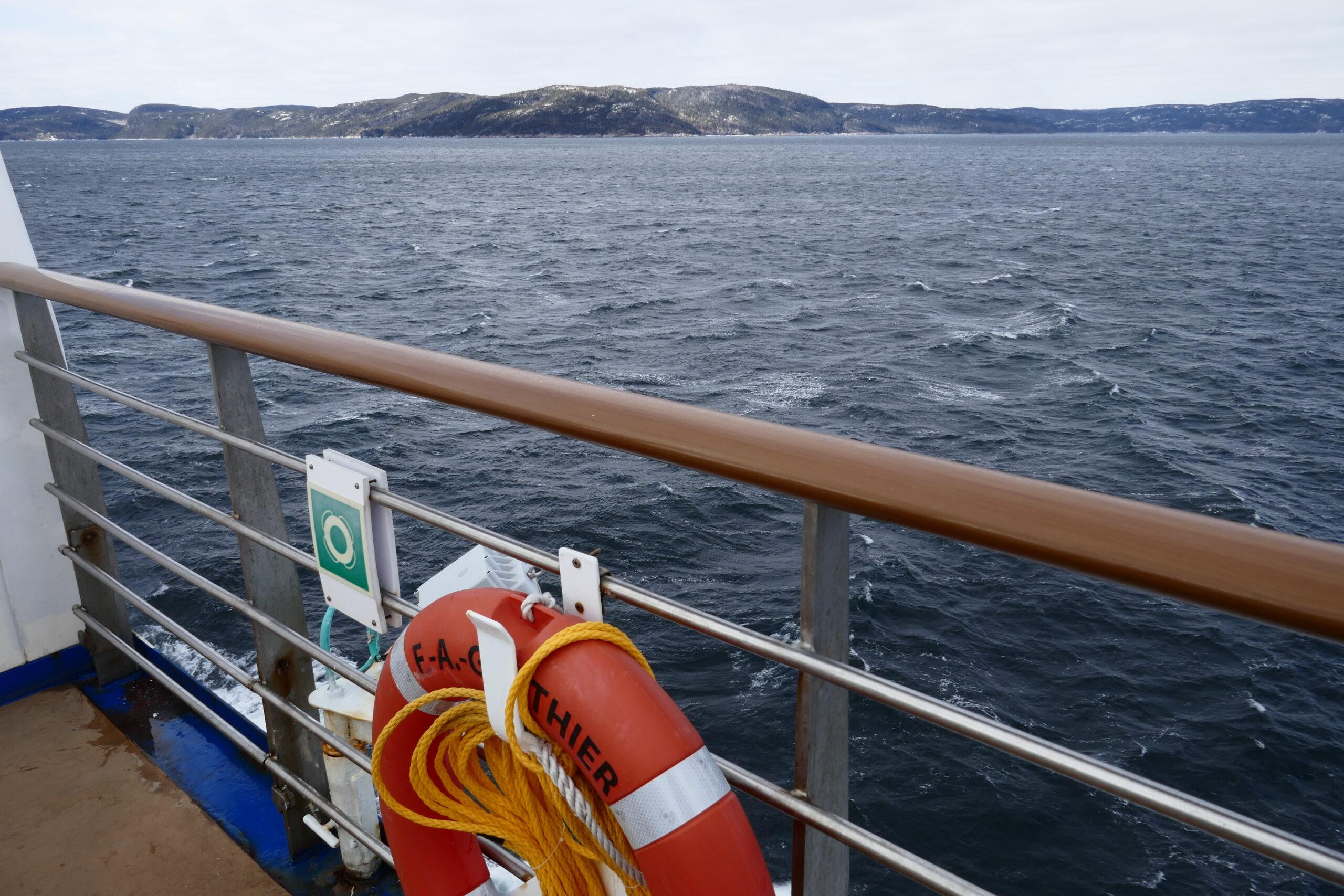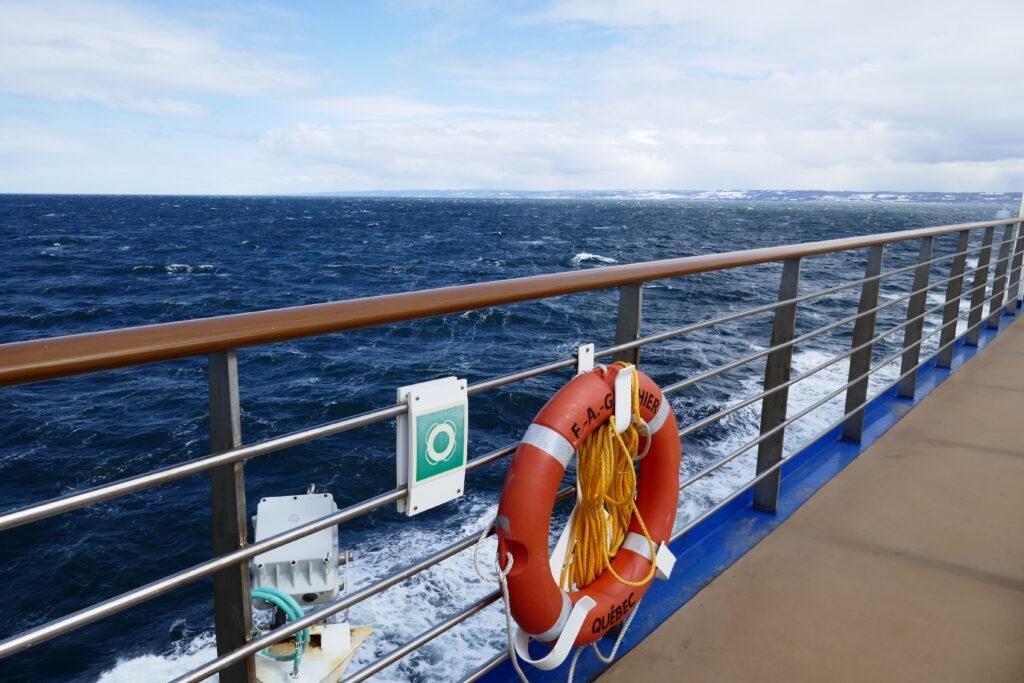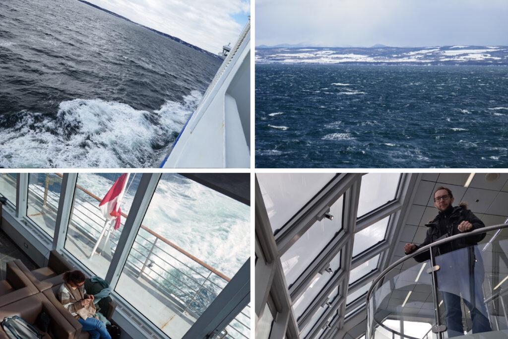 Les presque 60 km de traversée de l’estuaire du St-Laurent se font à bord du NM F.-A.-Gauthier de la STQ (Société des Traversiers du Québec) en 2h20. Nous avons croisé les doigts pour que la traversée ne soit pas annulée en raison des forts vents : ouf, nous traversons bien au jour et à l’heure dite. Un petit 35 km/h de vent et, malgré les rafales à 60km/h, les vagues restent très raisonnables. Par contre les sorties sur le pont extérieur sont assez… fraiches !