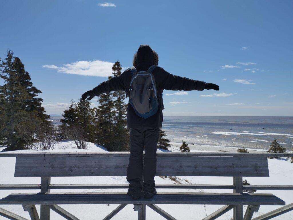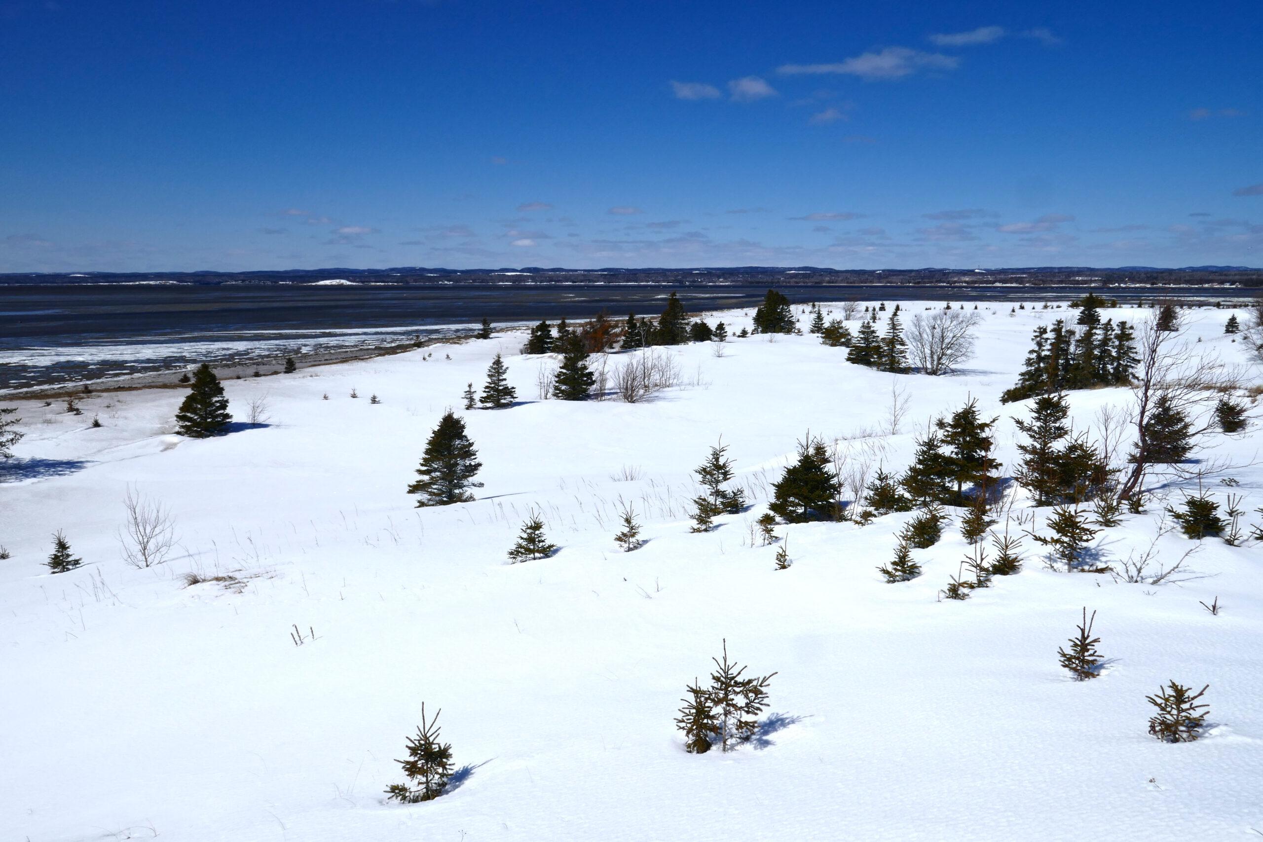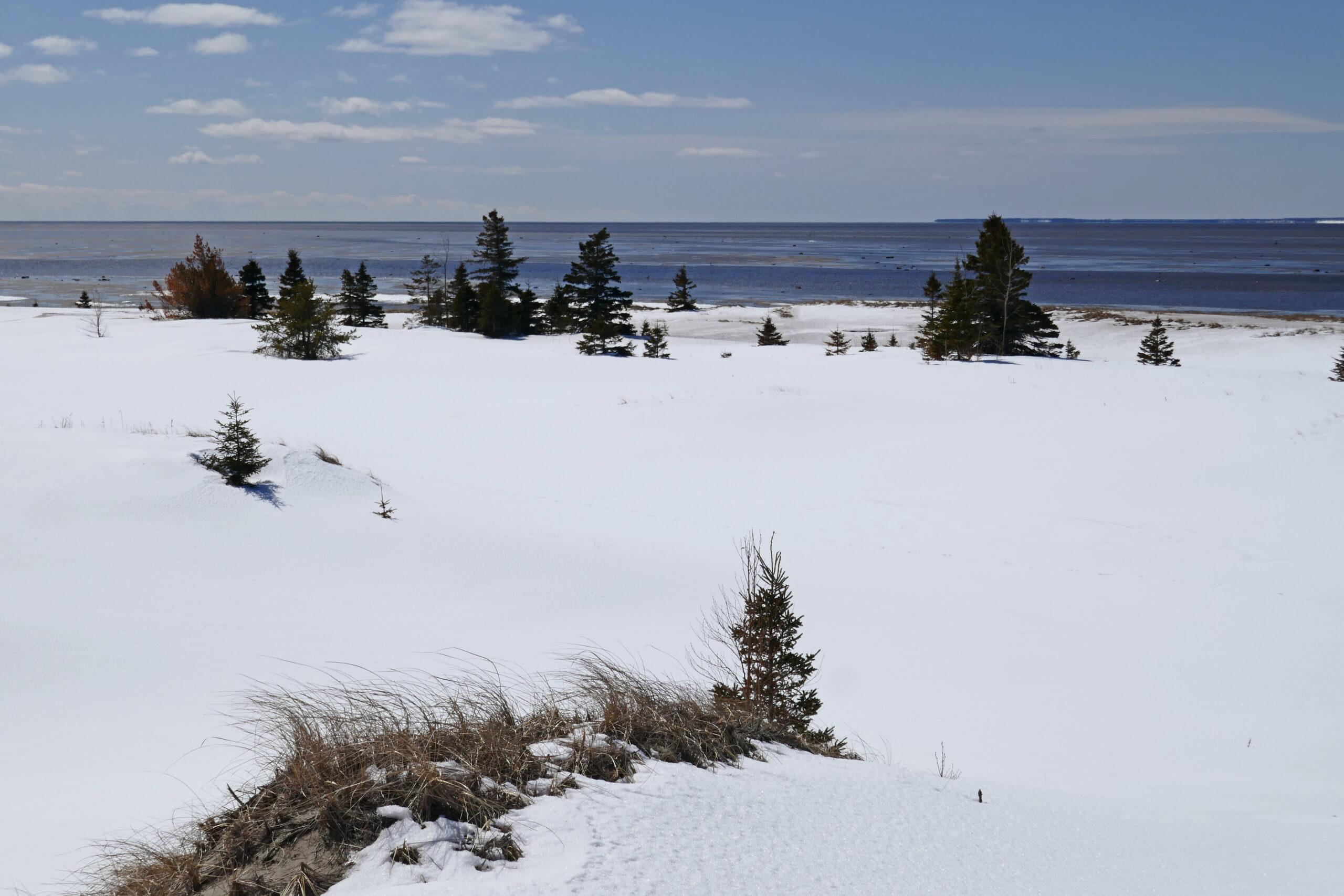 Une fois arrivé au parc, nous nous engageons sur le sentier Le Contemplatif (1,8 km) qui longe l’estuaire après s’être un peu enfoncé dans les bois. Avec la couche de neige, il n’est pas toujours évident de déterminer où est le sentier, et l’on s’enfonce vite de plusieurs centimètres… mais heureusement, des personnes en raquettes nous ont précédé, ce qui nous permet de placer nos traces dans les leurs. La boucle termine par les dunes qui surplombent l’estuaire. Magique.
