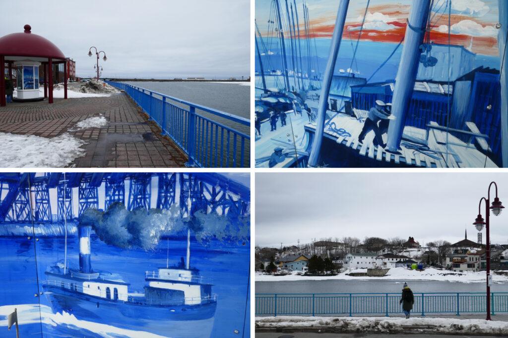 Relevons quand même la Promenades des capitaines qui longe la rivière Matane jusqu’à ce qu’elle se jette dans le St-Laurent. Ça y est, on retrouve les mouettes ! Quelques peintures relatent les grandes étapes qui ont menées à la construction de Matane et ses heures de gloire lorsque la ville était le principal port de desserte de la Côte-Nord avant que la route n’y aille. Heure où la principale activité consistait à raser des forêts entières pour en faire de la pulpe à papier ou exporter le bois vers l’Europe… Difficile de juger les agissements d’il y a 200 ans, mais on peu quand même s’interroger.