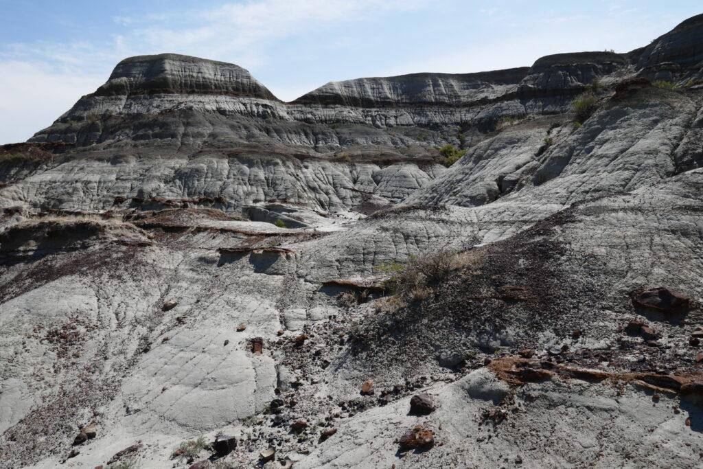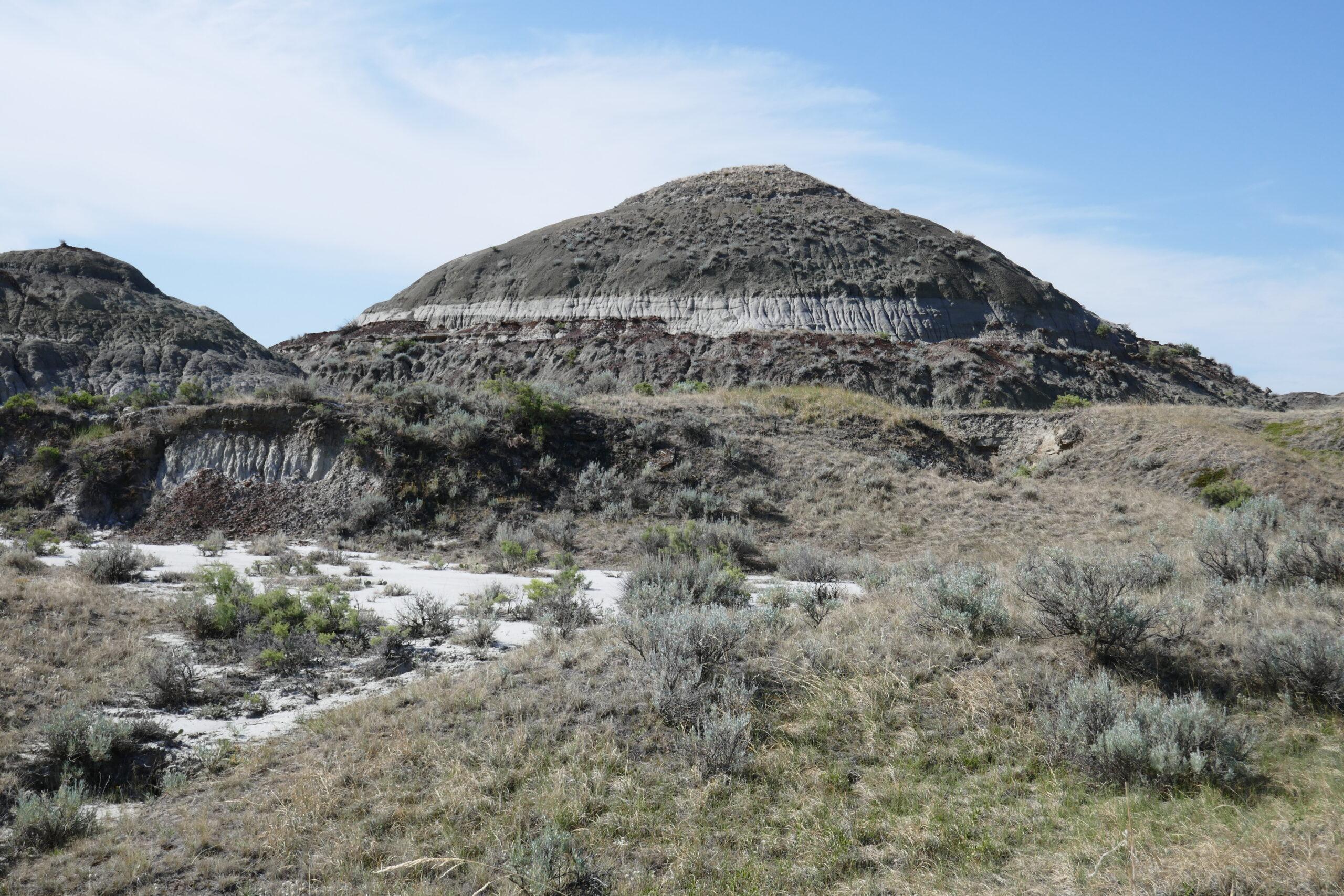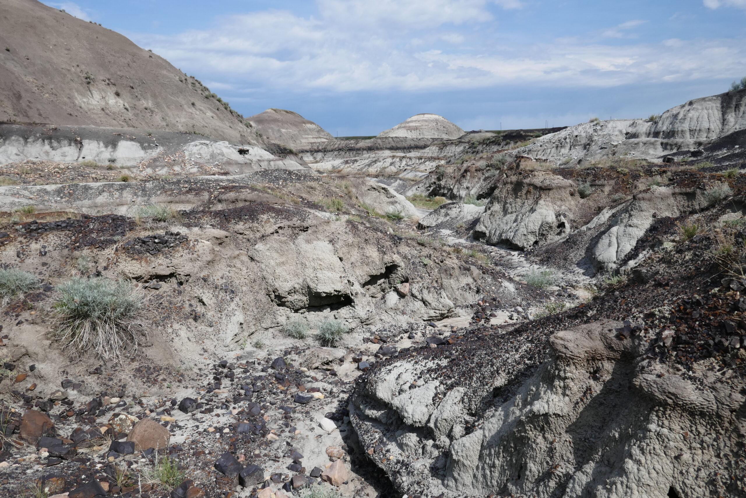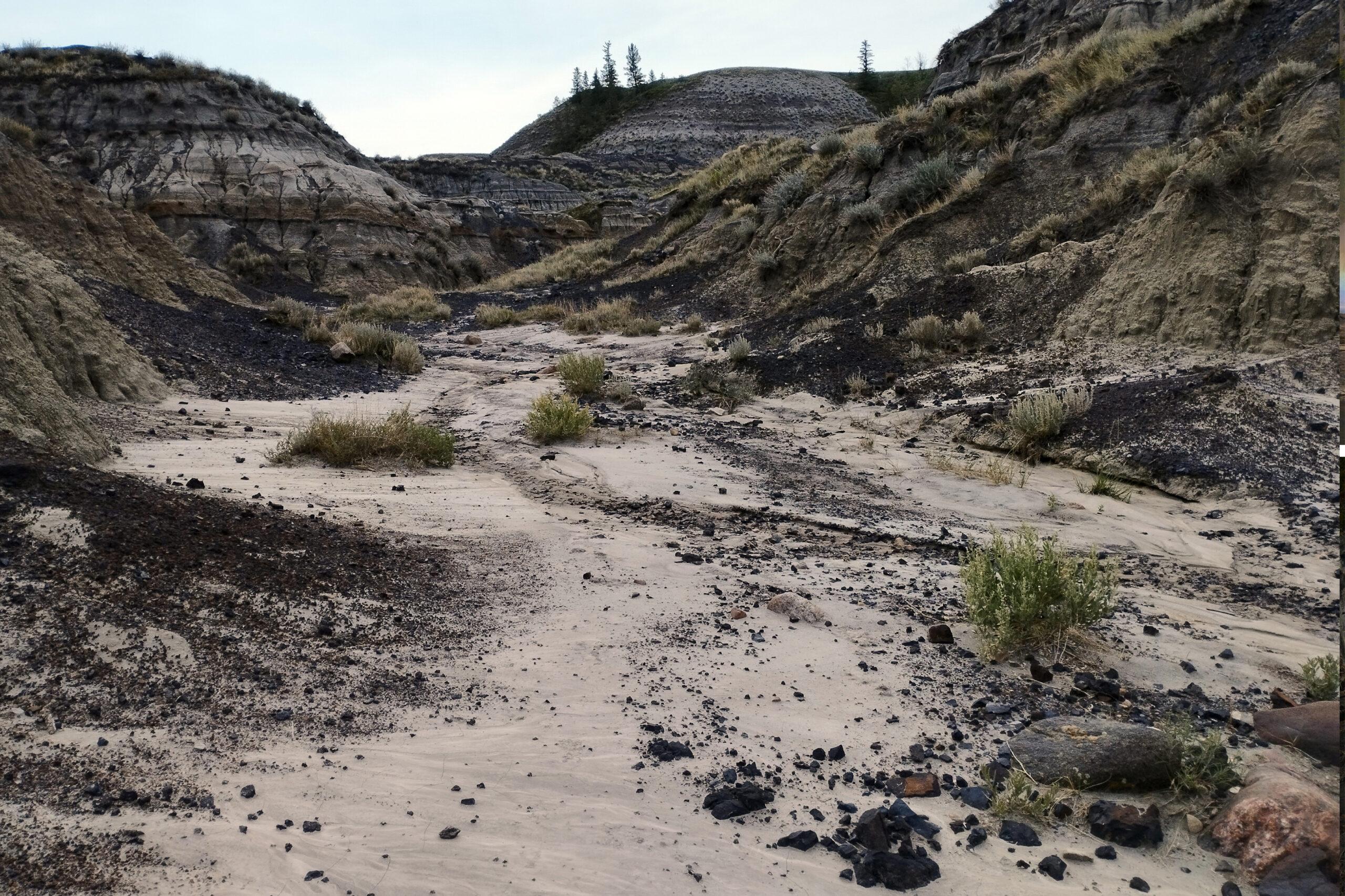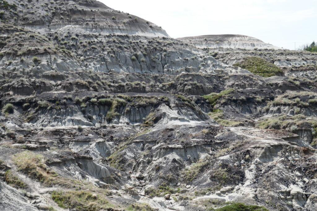 Si l’on prête attention aux collines environnantes typiques des paysages des Badlands, on peut percevoir une couche un peu plus noire, au-dessus de la couche des fossiles de dinosaures mais en-dessous de la végétation : c’est le charbon !