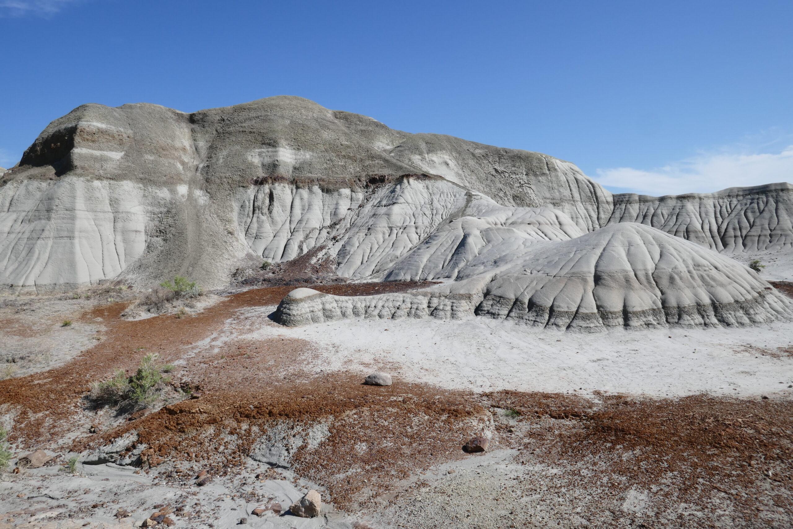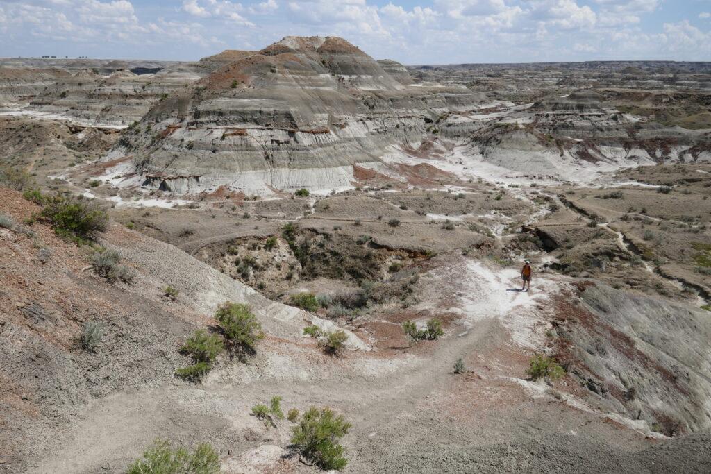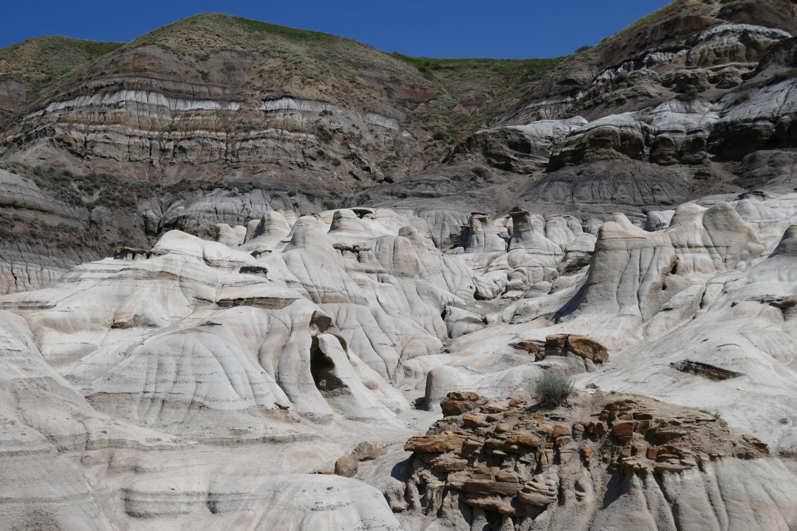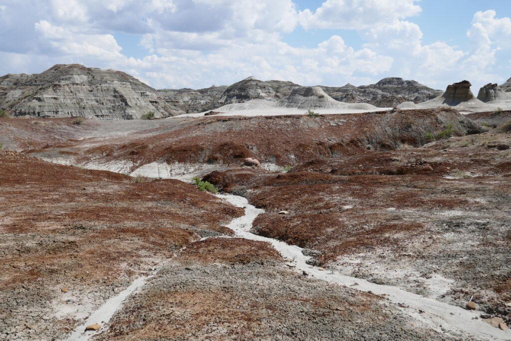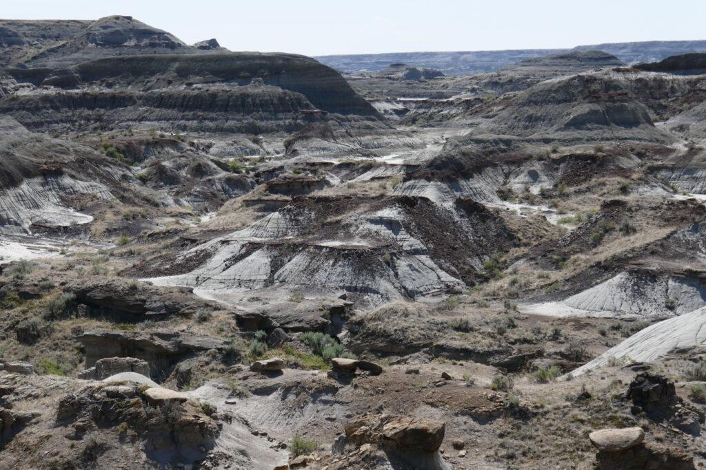 Si l’on prête attention aux collines environnantes typiques des paysages des Badlands, on peut percevoir une couche un peu plus noire, au-dessus de la couche des fossiles de dinosaures mais en-dessous de la végétation : c’est le charbon !