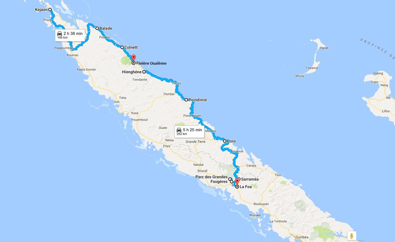 Départ du grand nord ! La route redescend en direction de Koumac, puis pique vers Ouéga à travers les montagnes. Un beau point de vue sur le lagon au col d’Amos, et nous continuons jusqu’à Pouébo. Peu avant, nous traversions le hameau de Balade.