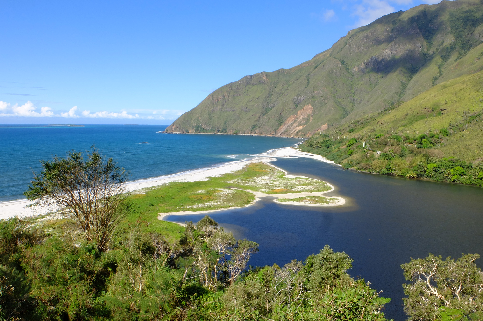 Juste avant le bac sur la rivière Ouaïème, dernier bac du pays, le point de vue est resplendissant ! En attendant le-dit bac, d’une capacité de 2 voitures mais opérant 24/24, un stand propose des gateaux au citron et des « bonbons à la coco » (gâteaux sucrés) sur le système de l’honesty box. Absolument succulents !!
