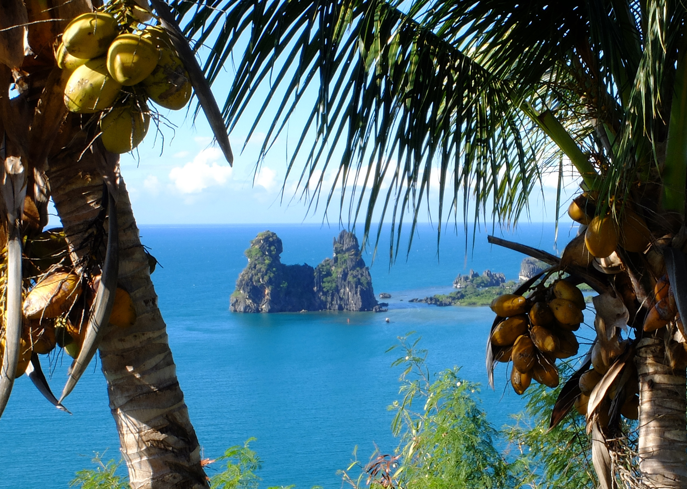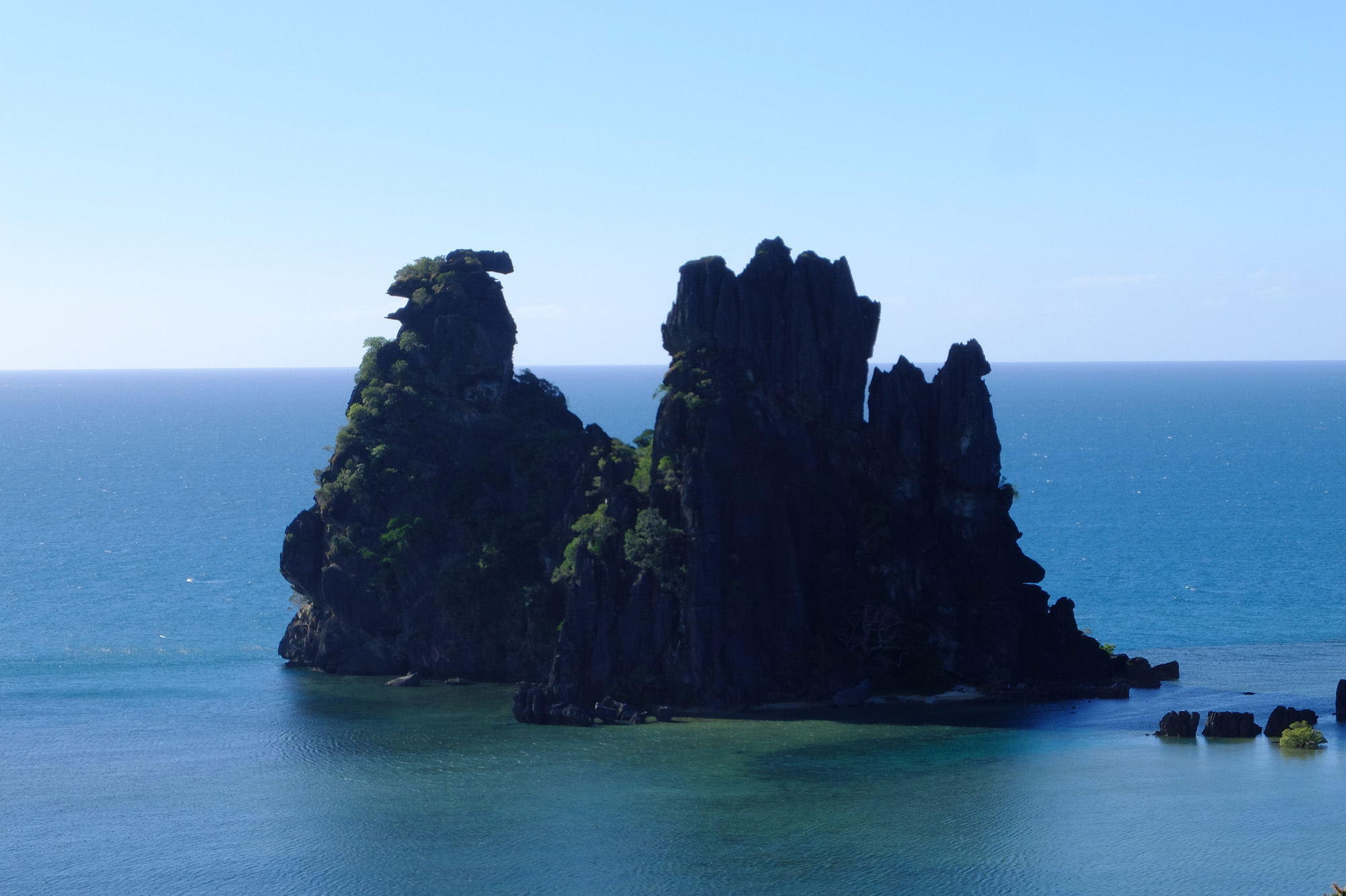 La route se poursuit vers Hienghène (Hyehen en fwâi, l’une des langues Kanak du lieu). En arrivant, premier panorama sur « Le Sphinx » et « La Poule Couveuse », deux formations rocheuses plongées dans la mer, qui ressemblent vraiment à ce que leur nom laisse supposer !