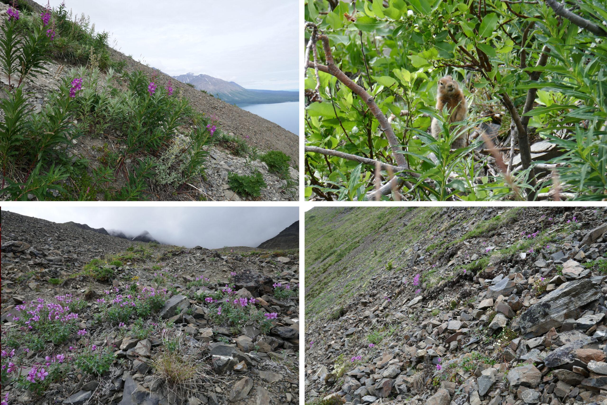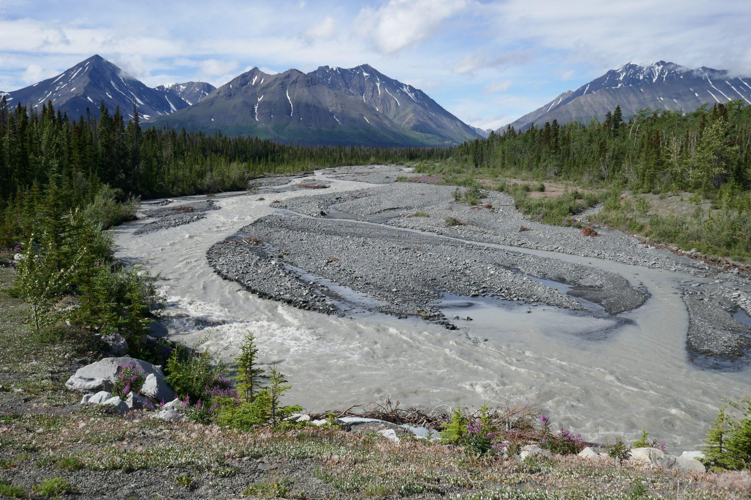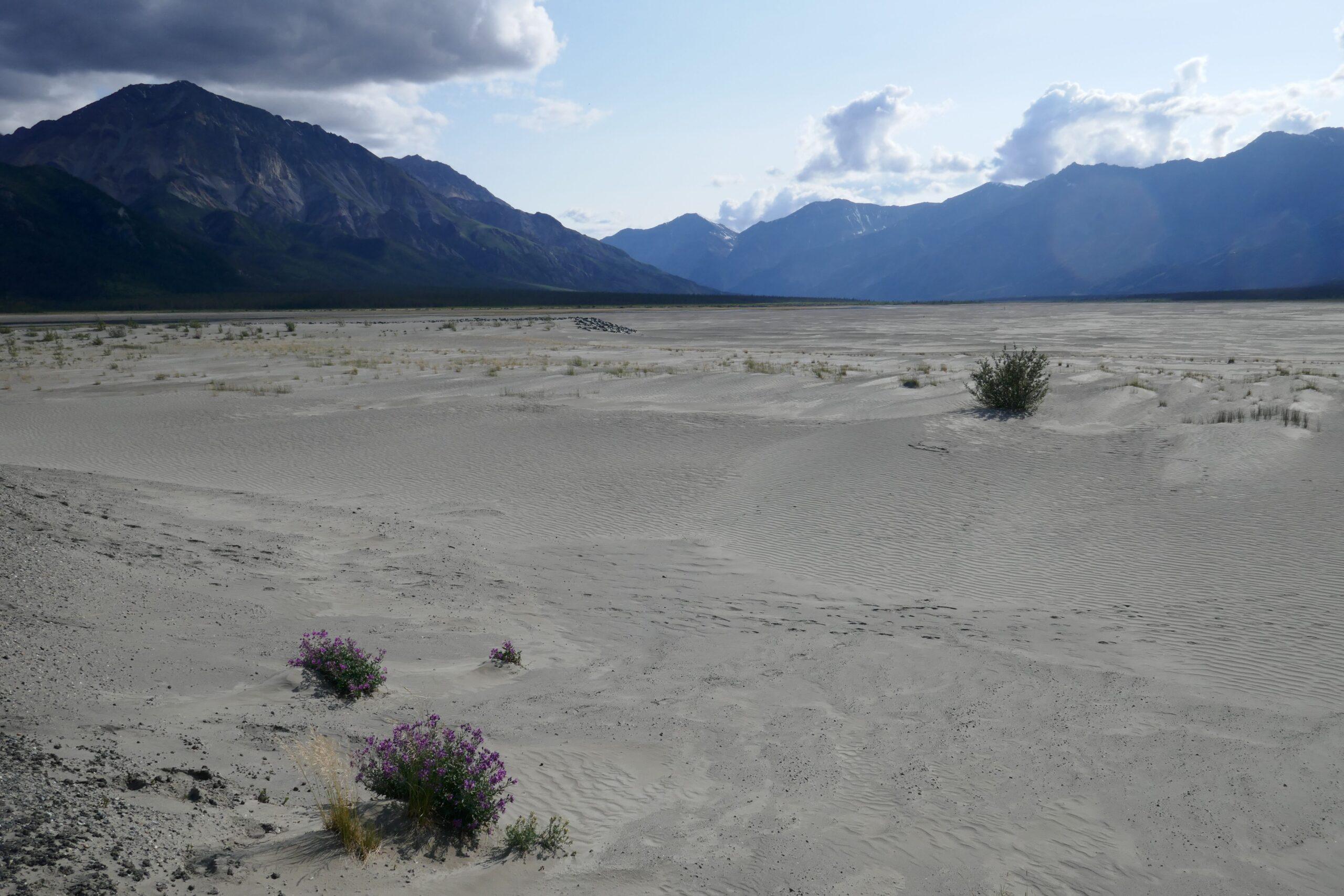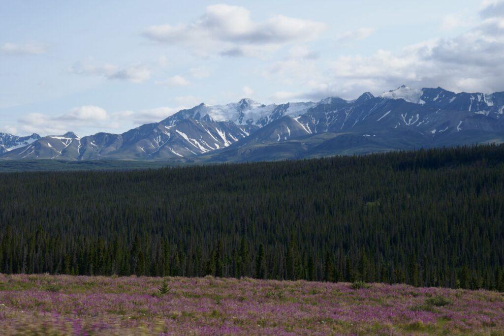 200 km après la frontière, l’Alaska Highway longe le Kluane Lake, entrant peu après dans le sublime Parc National Kluane. En toile de fond, les superbes sommets de la chaîne St-Elias, mis en relief par les épilobes (fleur emblématique du Yukon) aux couleurs violacées au premier plan. C’est non loin d’ici que se trouve le Mont Logan qui, du haut de ses 5 959 m, n’est autre que le plus haut sommet du Canada.