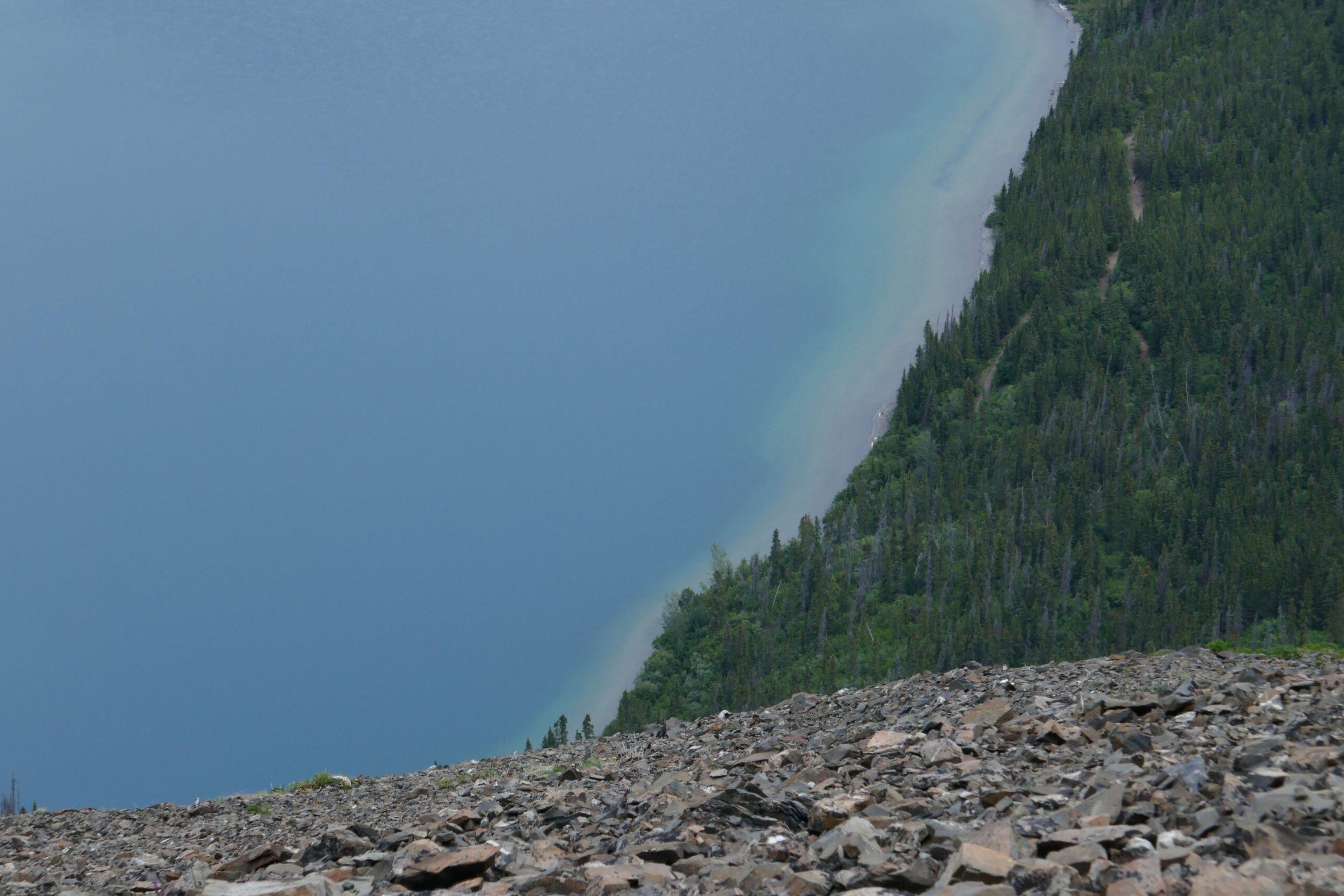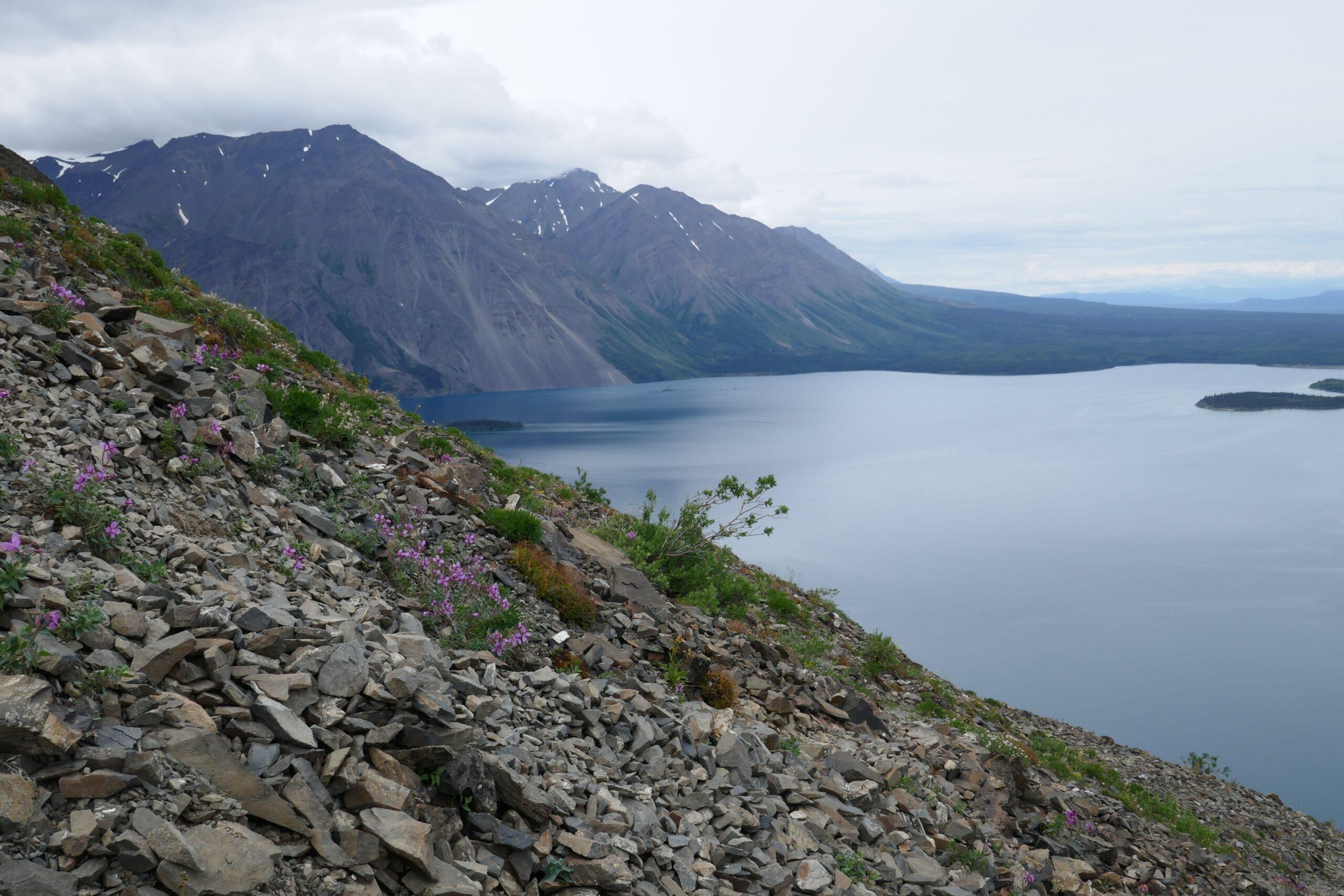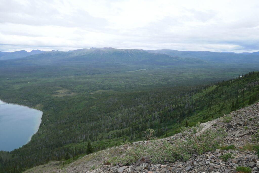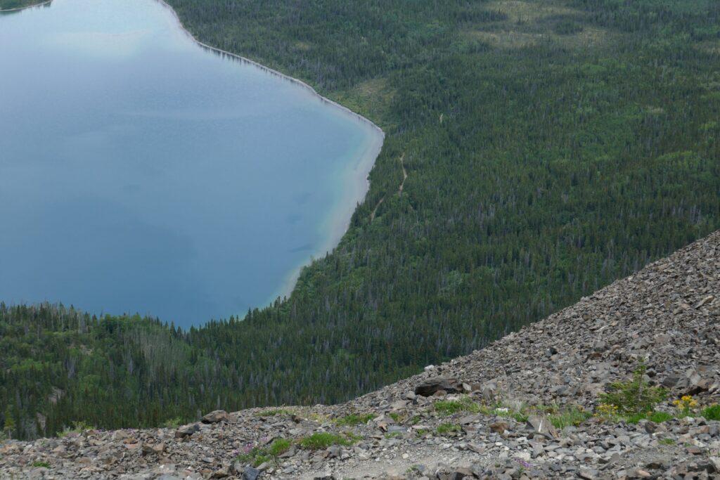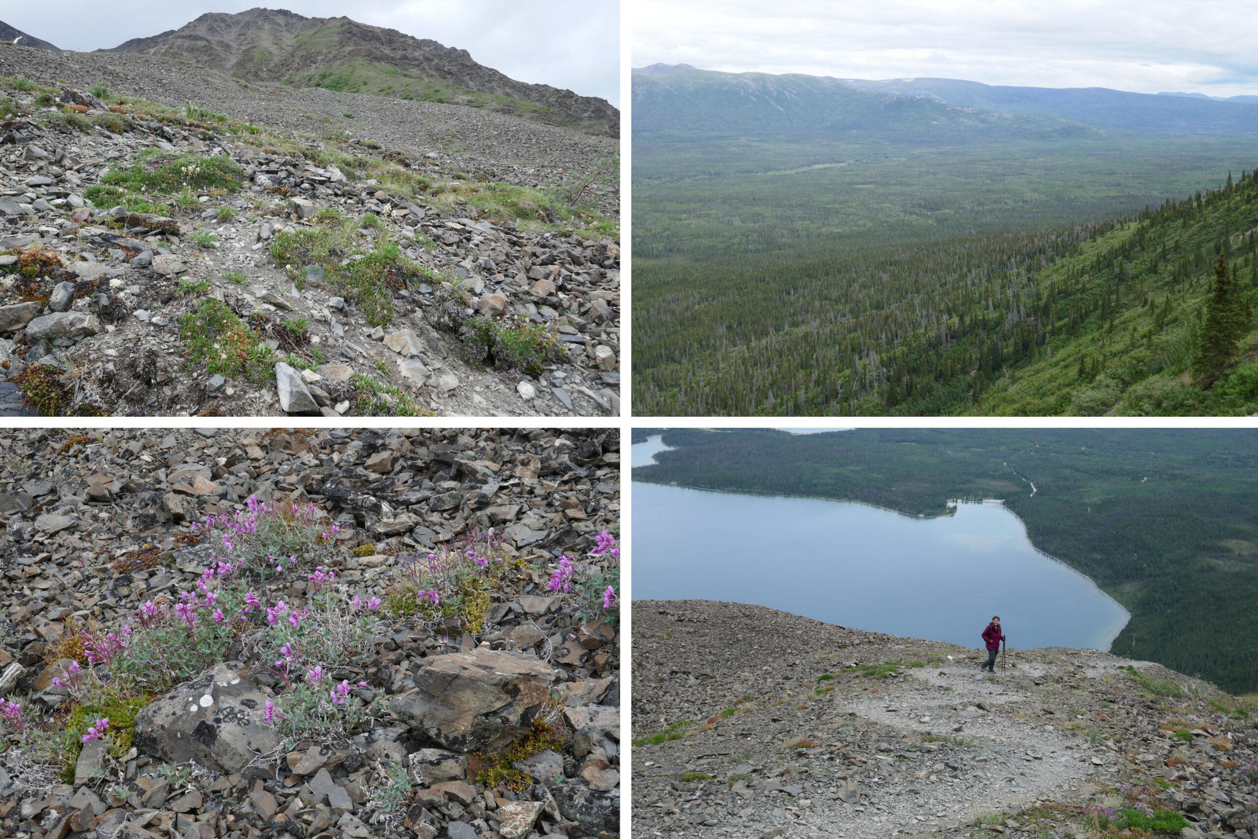 Le sentier qui monte au King’s Throne est à l’image du Yukon : tout en contraste. La randonnée commence à travers la forêt, avec un dénivelé faible. Après 50 minutes, l’on quitte la section commune avec le sentier qui longe le lac, et la montée commence ! Abrupte, très abrupte par endroits, on passe de la forêt à une zone rocailleuse -la description de Parcs Canada parle d’un « talus d’éboulis ». On valide ! La végétation est clairsemée. Le sentier n’est pas toujours bien indiqué, mais on arrive à ne pas trop s’en écarter avec un peu d’observation.