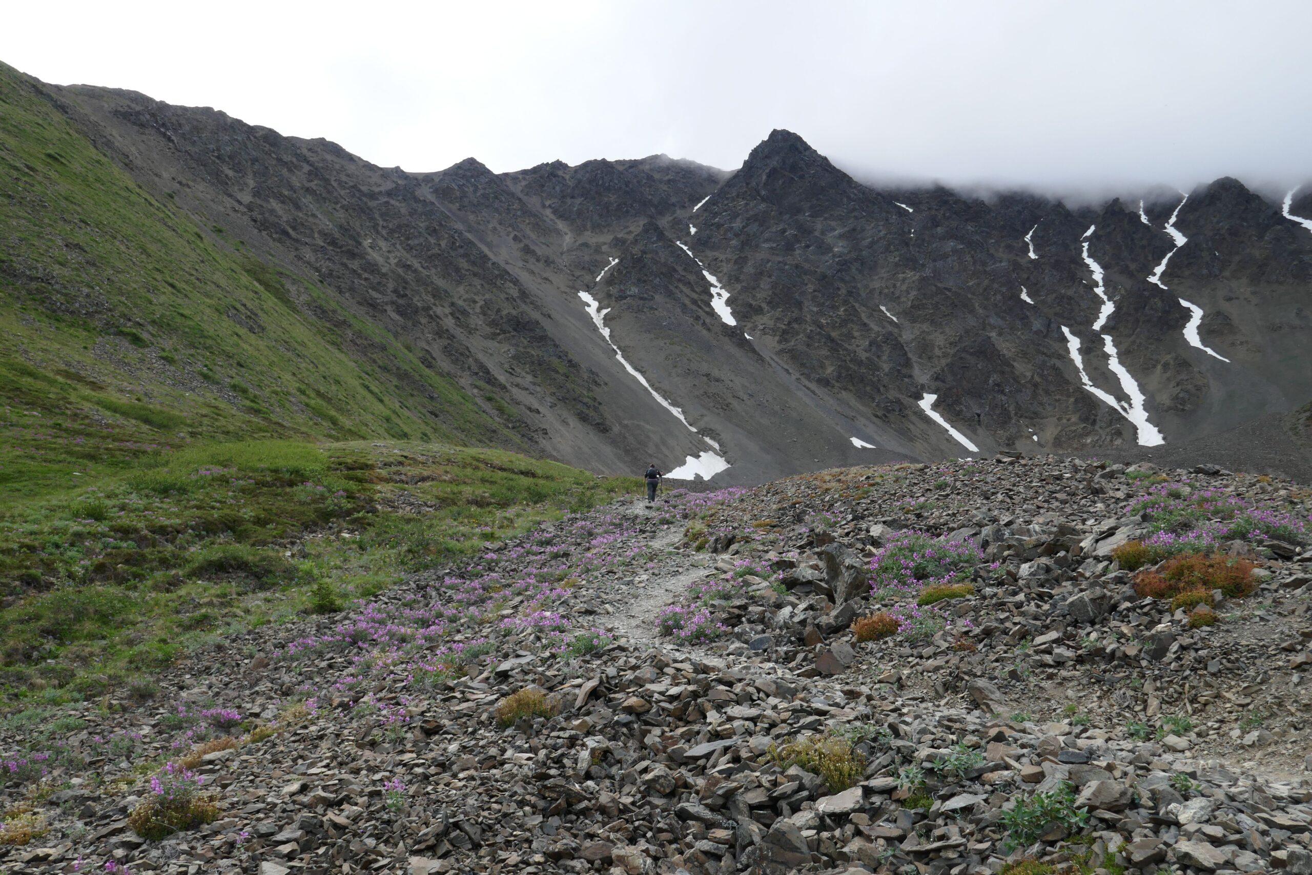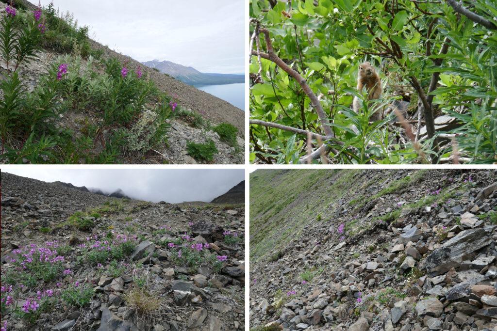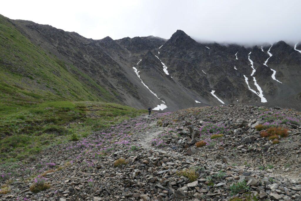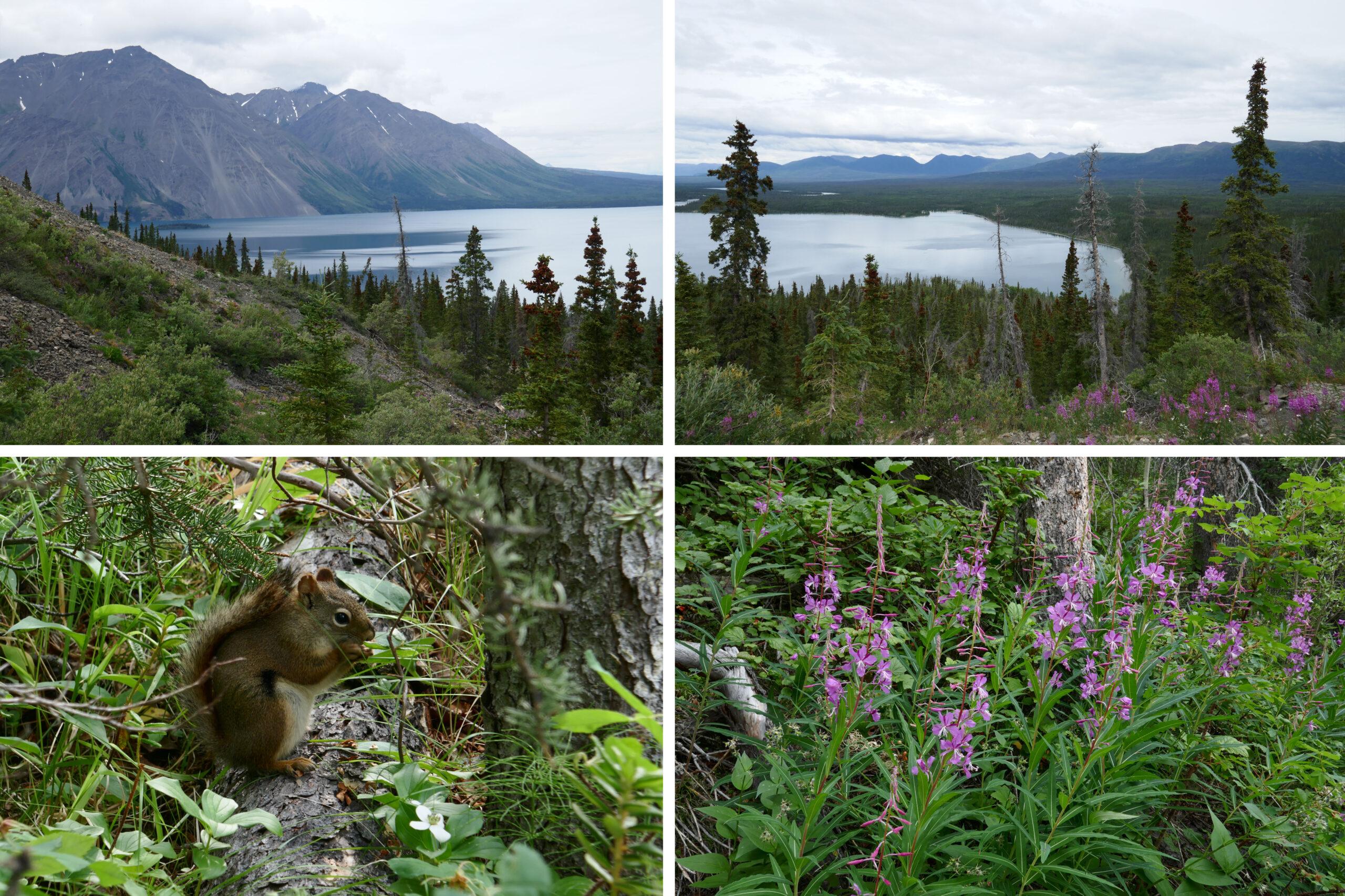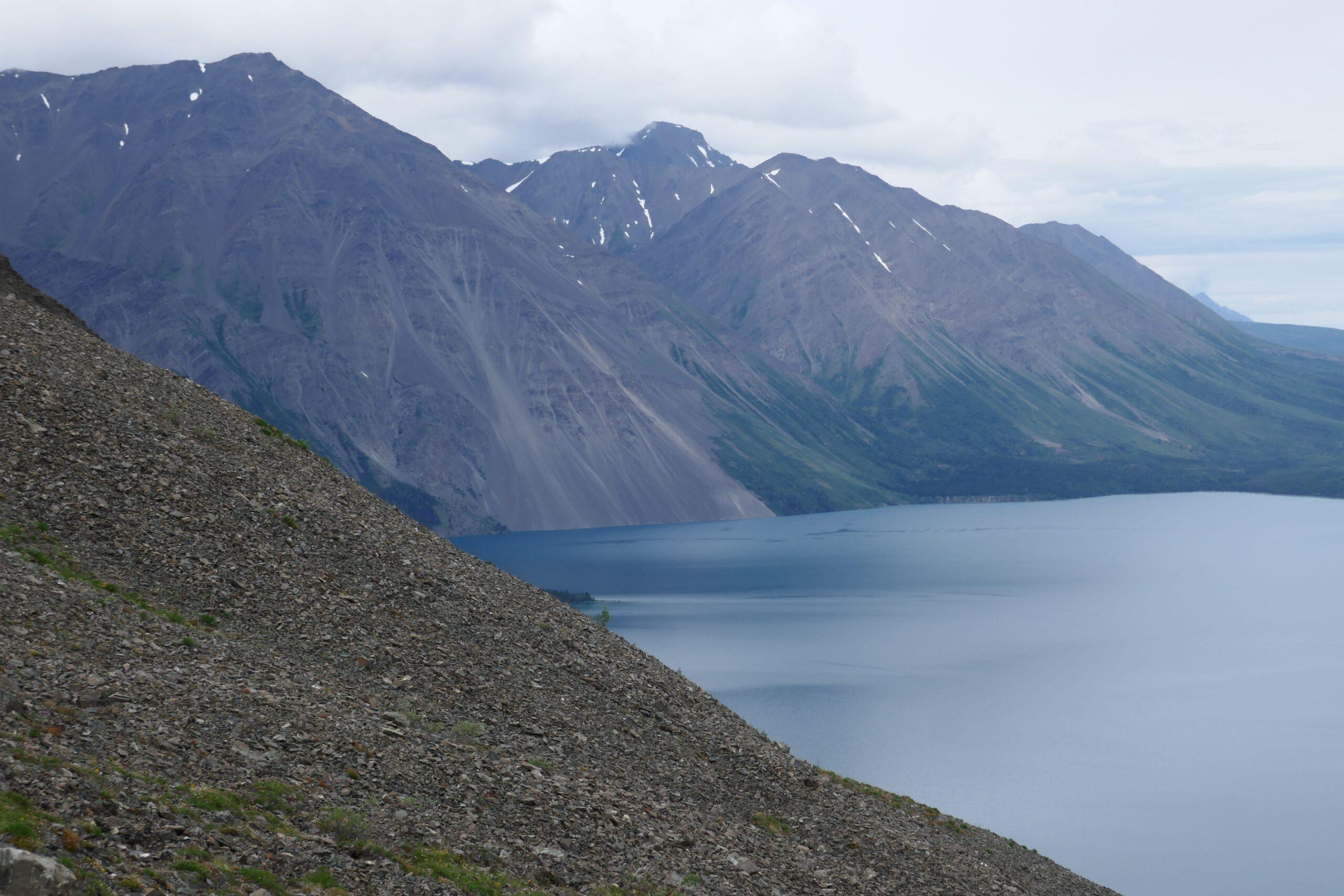 Le sentier qui monte au King’s Throne est à l’image du Yukon : tout en contraste. La randonnée commence à travers la forêt, avec un dénivelé faible. Après 50 minutes, l’on quitte la section commune avec le sentier qui longe le lac, et la montée commence ! Abrupte, très abrupte par endroits, on passe de la forêt à une zone rocailleuse -la description de Parcs Canada parle d’un « talus d’éboulis ». On valide ! La végétation est clairsemée. Le sentier n’est pas toujours bien indiqué, mais on arrive à ne pas trop s’en écarter avec un peu d’observation.