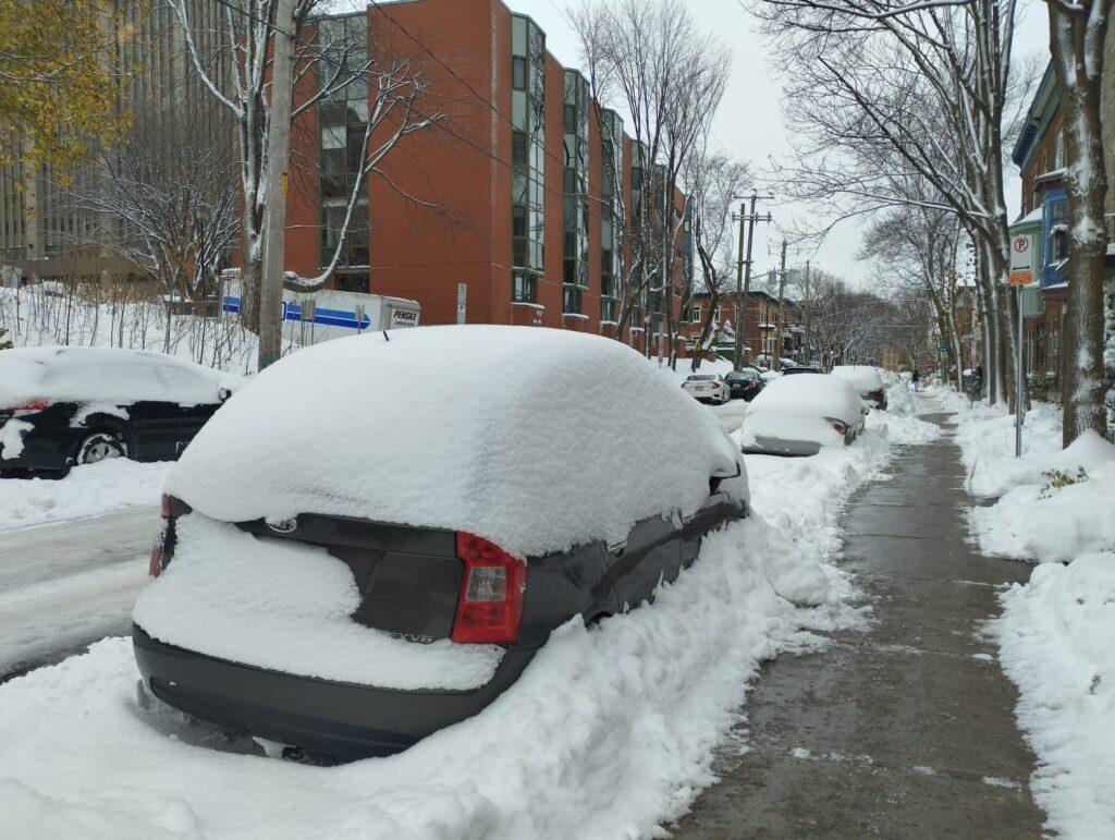 Les collègues avaient prévenu : il est impératif de déneiger sa voiture chaque jour, sous peine de cumuler les couches de neige qui s’accumulent sur la couche de la veille, givrée par les températures nocturnes. Avec 10-15 minutes de déneigeage de voiture additionnée à une alerte déneigement de rues dans la nuit, notre décision est prise : la voiture dormira en parking intérieur.