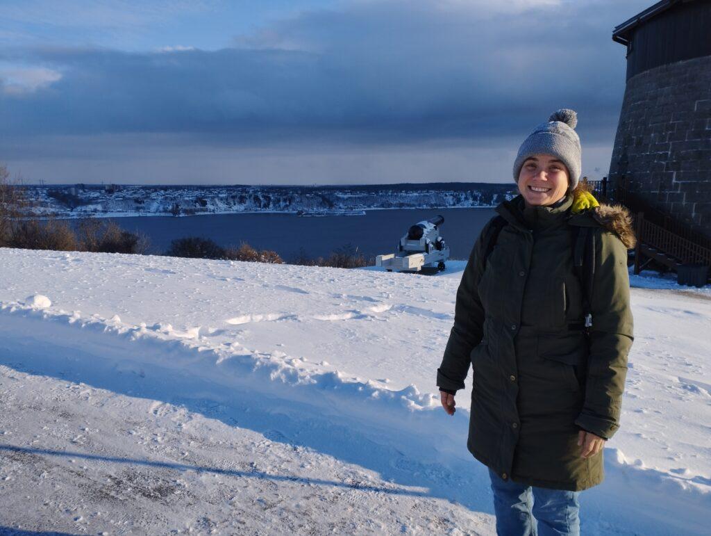 Un petit vent oscillant entre 25 et 40 km/h (tiens, la neige tombe à l’horizontale ici!) additionnée à du 8h-18h de chute de flocons présentent une bonne petite couche de neige au sol.
