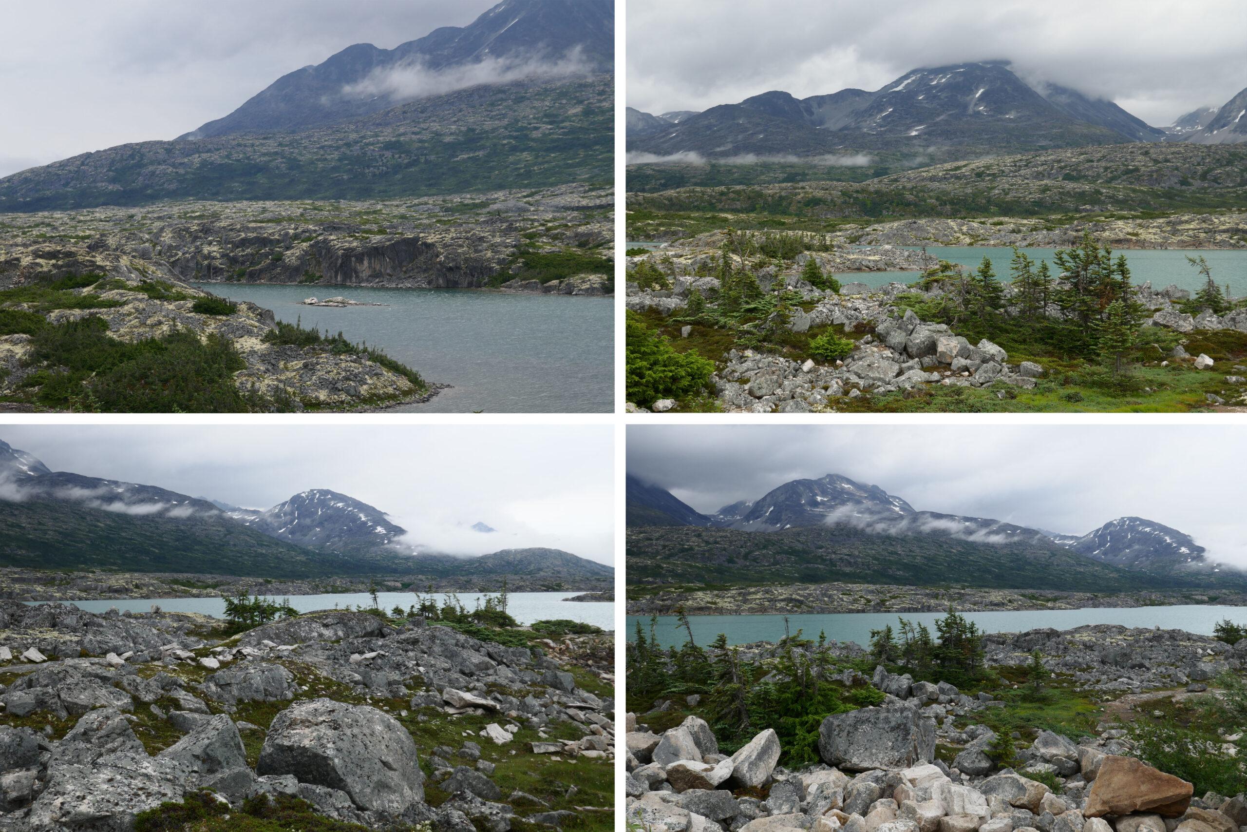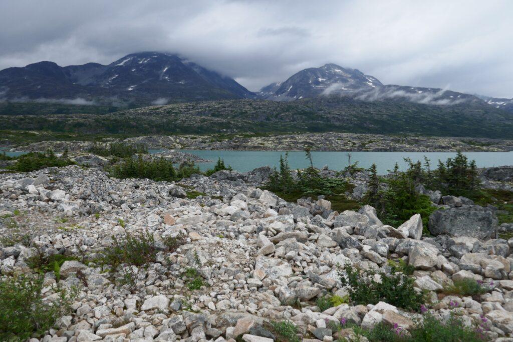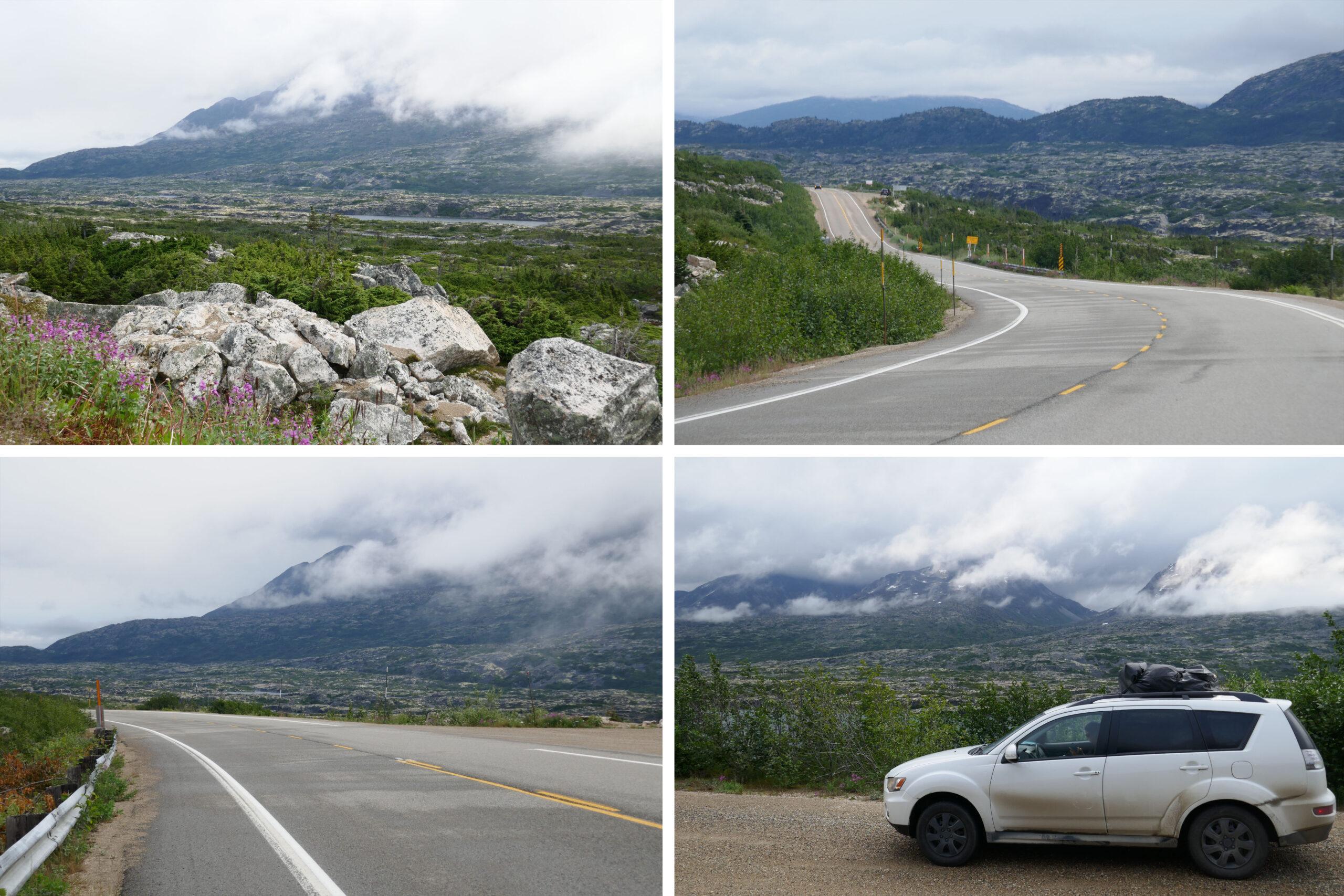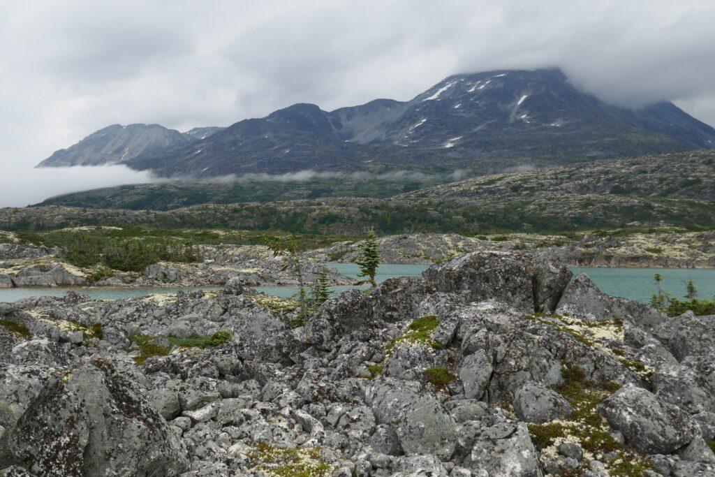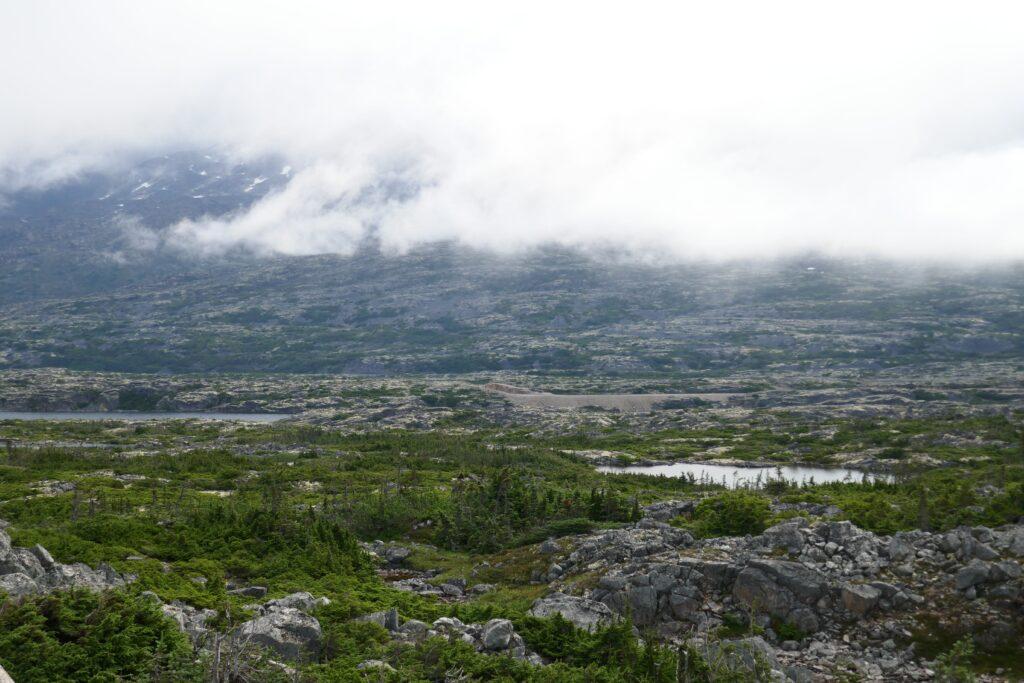 Quittant Skagway en direction de Whitehorse, nous ne profitons pas beaucoup des paysages le long de la route du Klondike sud avant la frontière Alcan (Alaska/Canada). En effet, le plafond nuageux est extrêmement bas et les pluies intermittentes. C’est seulement entre le poste de douane américain et le poste de douane canadien de Fraser que le temps devient plus propice à la contemplation. Dès lors, c’est une succession de superbes lacs pris entre les rochers recouverts de mousse. On s’arrête littéralement toutes les 5 minutes pour profiter des vues entre le sommet du col et Summit Lake.