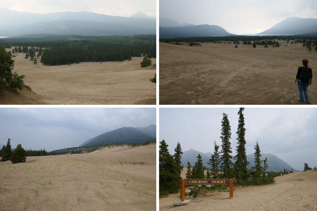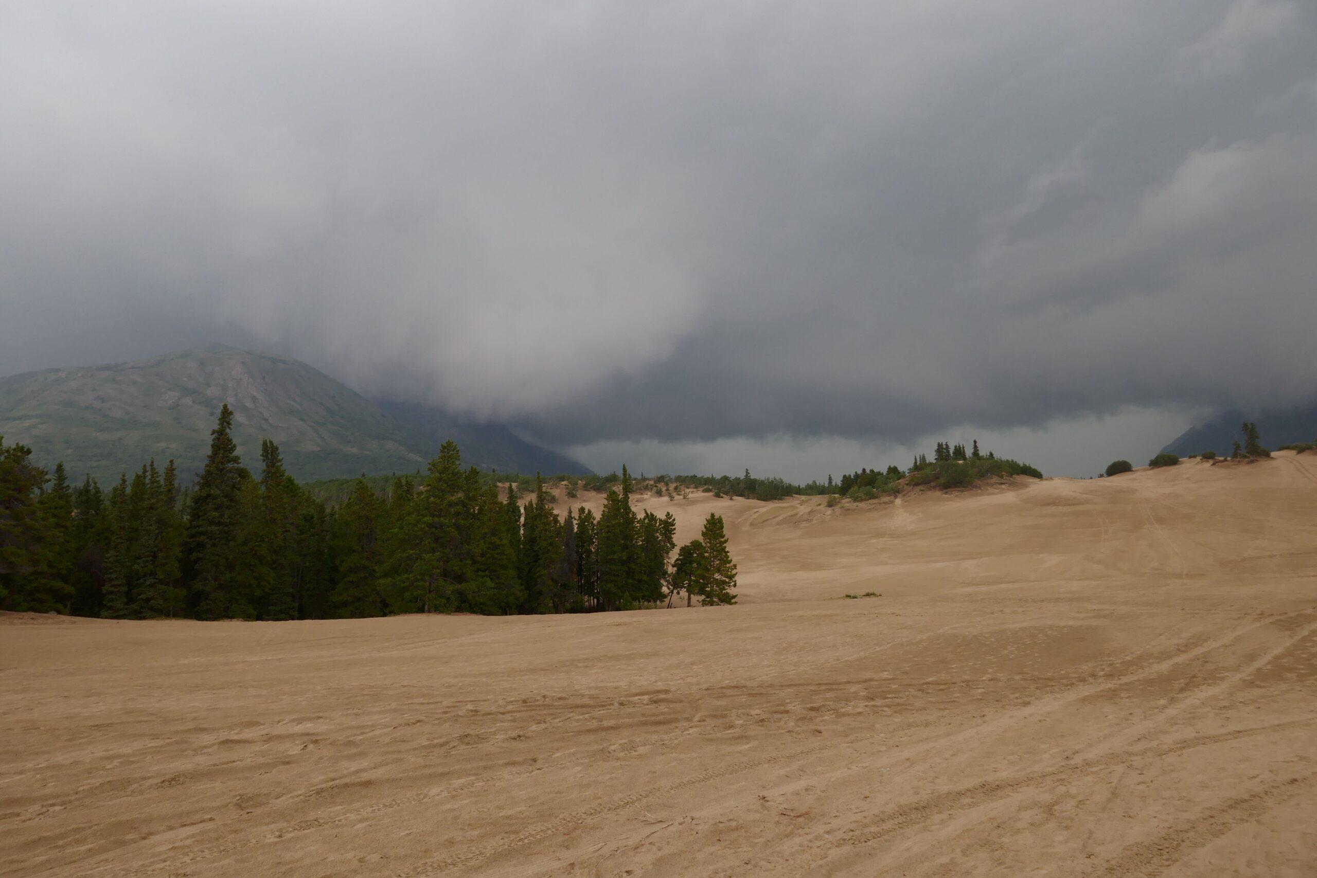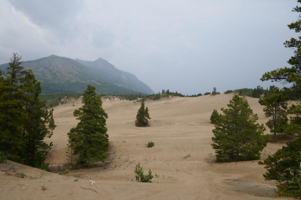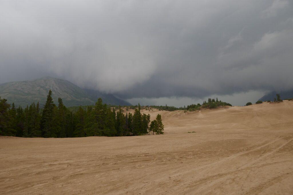 À deux kilomètres au nord de la ville, Carcross Desert est présenté comme « le plus petit désert du monde », avec sa superficie de 2,6 km². En réalité, il ne s’agit pas au sens strict d’un désert, mais d’un « système dunaire » , une zone où la fin de la période glaciaire mena à l’assèchement des lacs. Depuis, les montagnes environnantes bloquent la plupart des précipitations sur ce secteur précis. On n’aura pas l’occasion de vérifier cette assertion, un orage plutôt intense s’abattant sur nous au moment où nous nous préparions à quitter le désert !