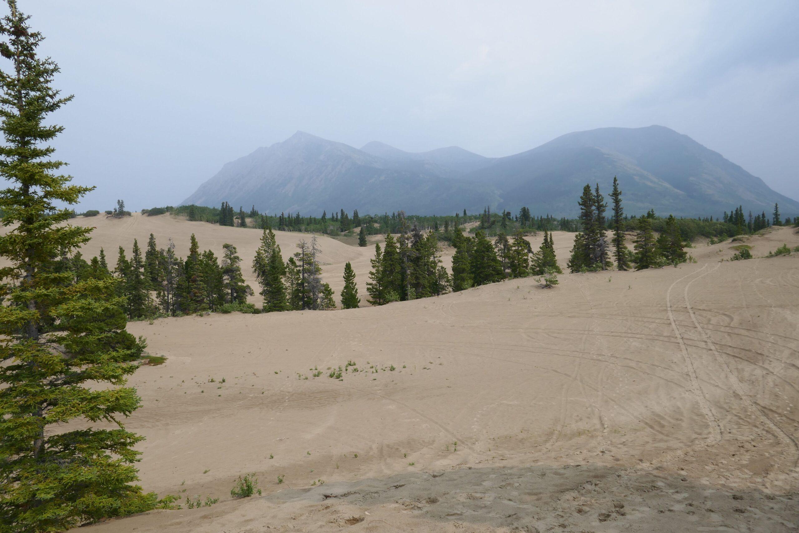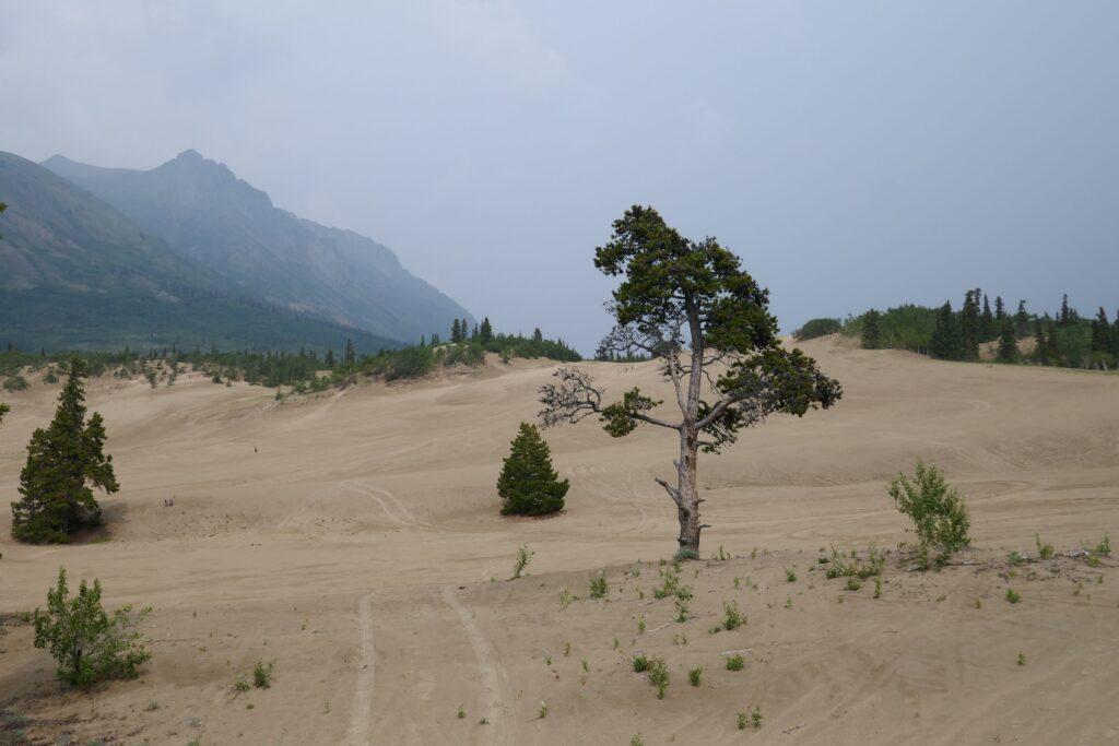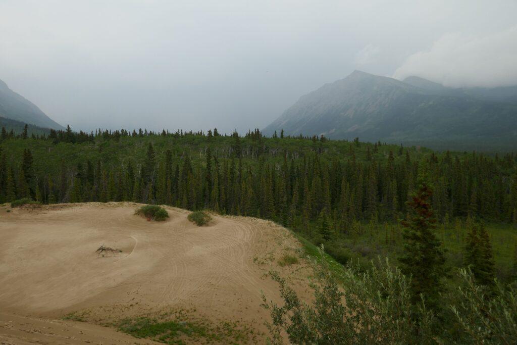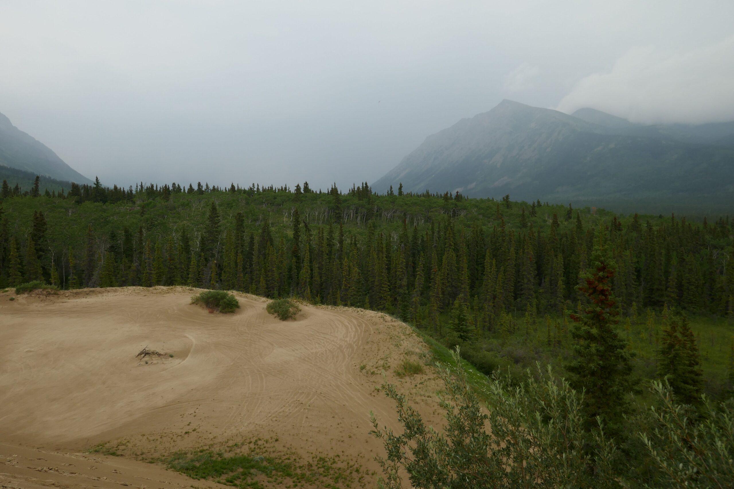 À deux kilomètres au nord de la ville, Carcross Desert est présenté comme « le plus petit désert du monde », avec sa superficie de 2,6 km². En réalité, il ne s’agit pas au sens strict d’un désert, mais d’un « système dunaire » , une zone où la fin de la période glaciaire mena à l’assèchement des lacs. Depuis, les montagnes environnantes bloquent la plupart des précipitations sur ce secteur précis. On n’aura pas l’occasion de vérifier cette assertion, un orage plutôt intense s’abattant sur nous au moment où nous nous préparions à quitter le désert !