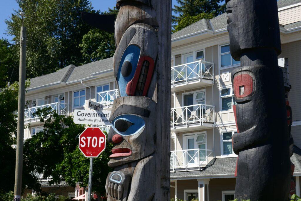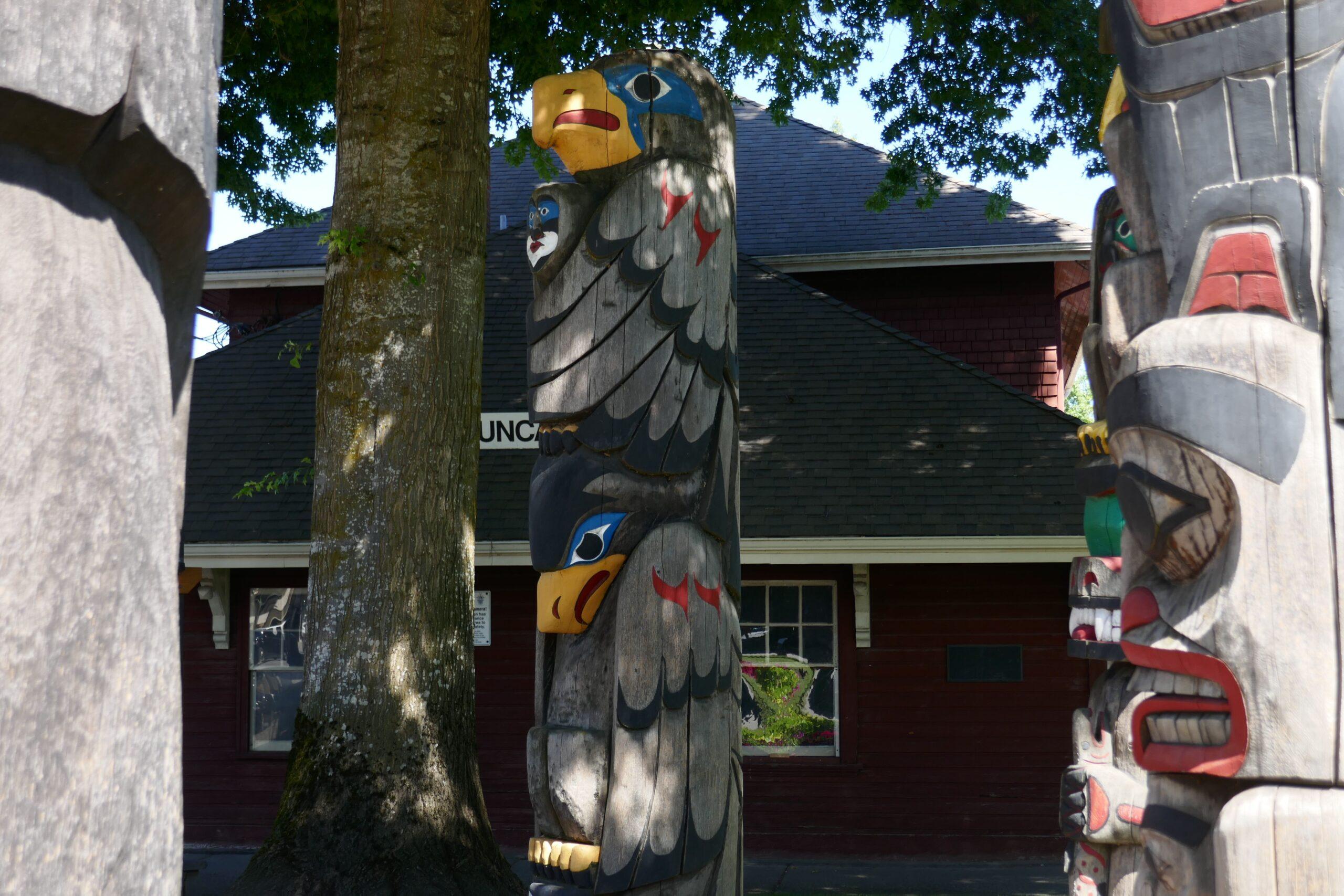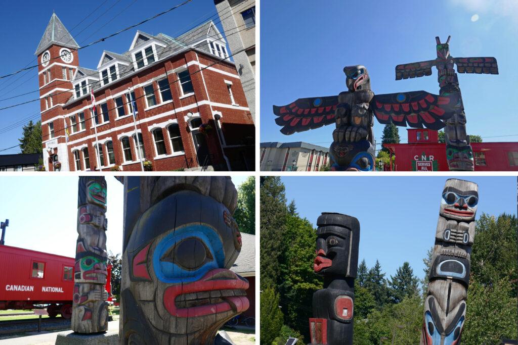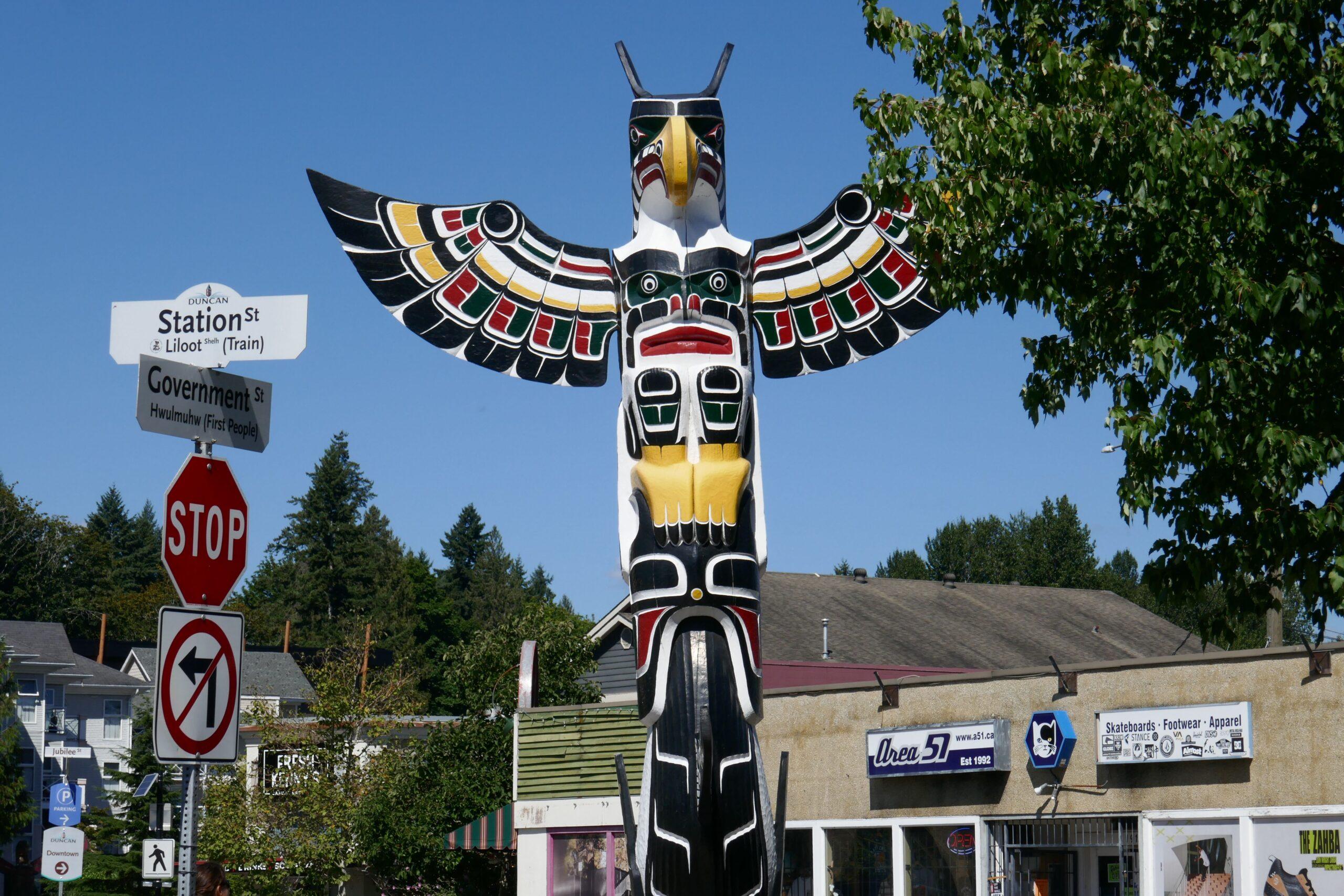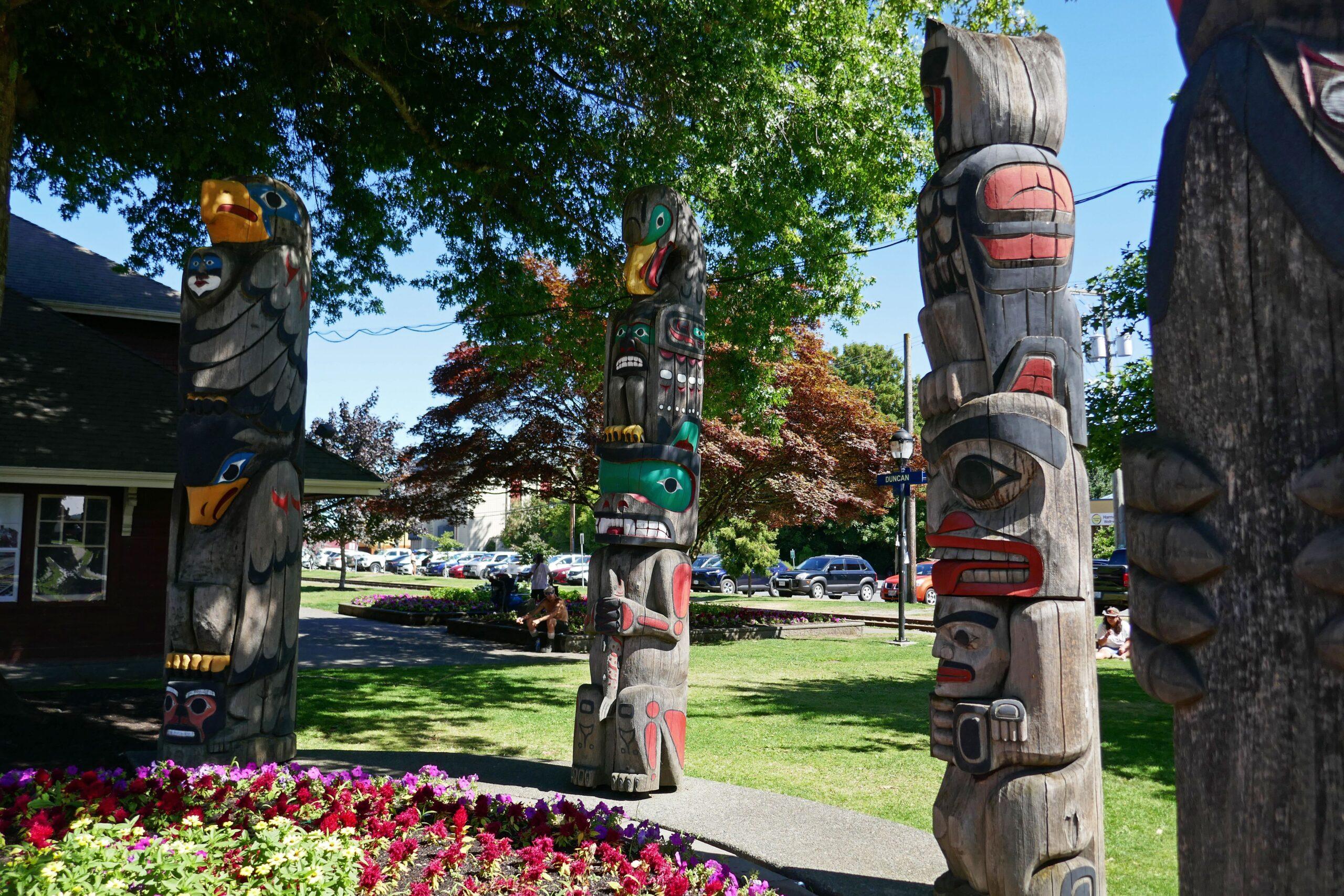 La ville de Duncan est connue pour ses nombreux totems disséminés dans ses rues. Tous sont construits à partir d’un bois de cèdre rouge, considéré par les Premières Nations de l’ouest comme « l’arbre mère ». Ceux-ci étaient en effet à la base de presque tous les objets : du canoé au masque de cérémonie, du vêtement au bois de chauffage, du bol de nourriture aux boites, chaque partie du cèdre était utilisée. Lorsqu’un cèdre était abattu pour créer un totem, une cérémonie était organisée afin de faire communier l’esprit du cèdre avec l’esprit du sculpteur.