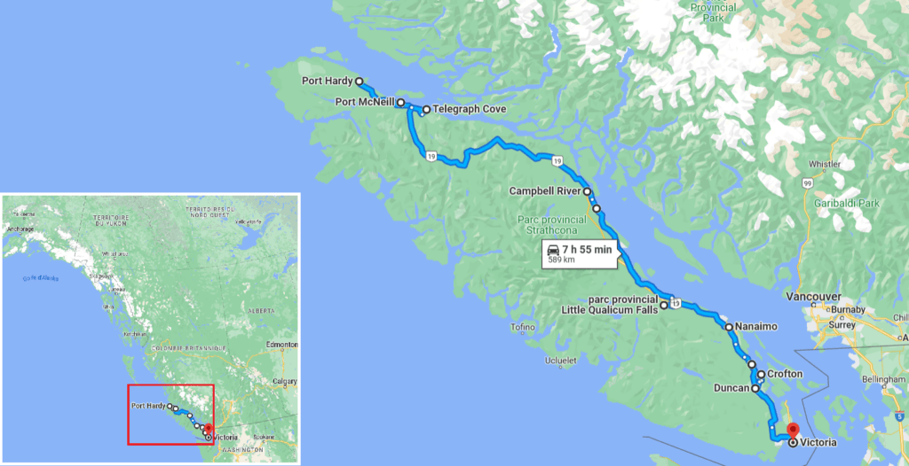 Le ferry en provenance de Prince Rupert par le Passage Intérieur (Inside Passage) nous dépose à minuit à Port Hardy, au nord de l’île de Vancouver (Vancouver Island). Tant qu’à faire, une fois la nuit passée, autant nous promener dans les rues de cette petite ville d’environ 4 000 habitants !