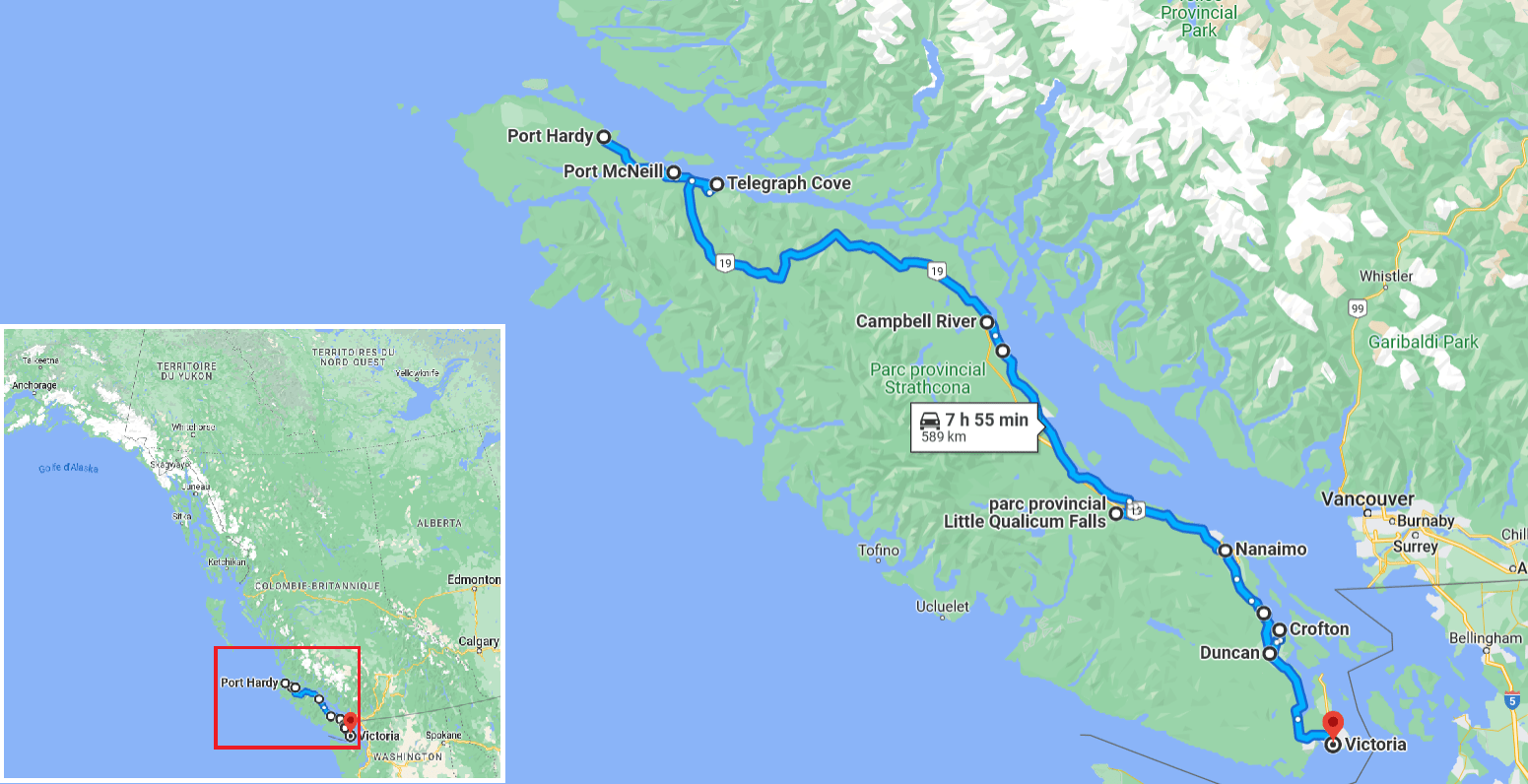 Au réveil, une question se pose : nous sommes à l’embranchement, allons-nous bifurquer vers Tofino, ou continuer vers Victoria ? En partie en raison des conditions (route en travaux depuis le feu de forêt du mois passé, avec fermeture totale entre 8h et 11h30 et entre 13h30 et 18h00, et circulation alternée en voie unique sur 7km en-dehors de ces plages…) nous optons plutôt pour la seconde option : nous reviendrons en arrière si le cœur nous en dit…