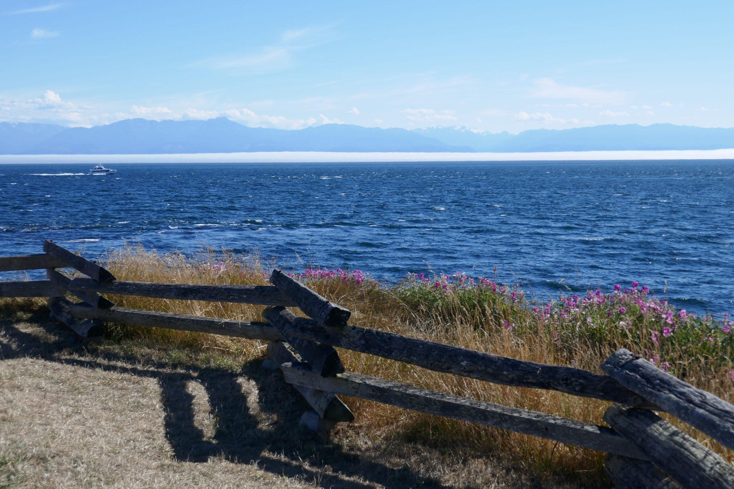 Le chemin retour longe Dallas Road et la façade océanique. Des plages et une végétation différente au premier plan, les sommets du Olympic National Park (État de Washington, USA) sur la rive opposée : est-on toujours au même endroit ?